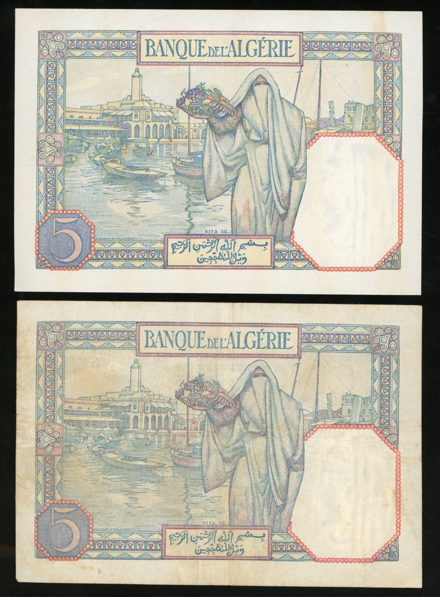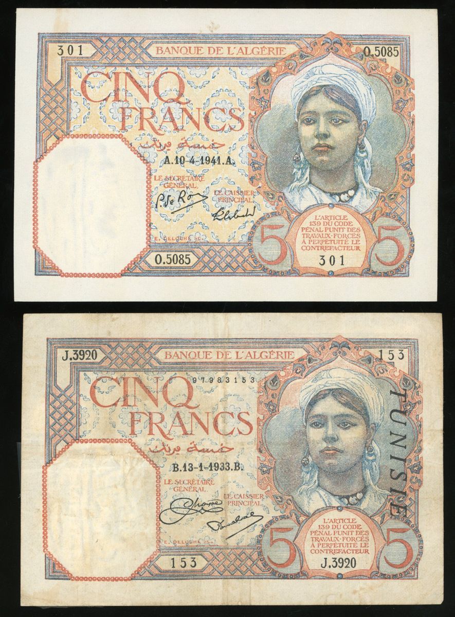 Banque de l'Algérie, a pair of 5 francs, 1933 and 1941, serial numbers 153 J.3920 and O.5085 301