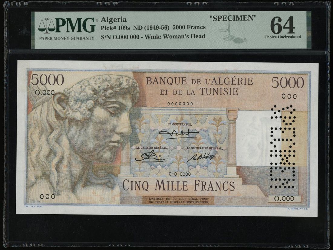 Algeria, 5000 francs, ND(1949-56), specimen, serial number O.000 000, (Pick 109s), PMG 64, choice uncirculated,the 2nd high grade in PMG population, only one graded higher, rare.