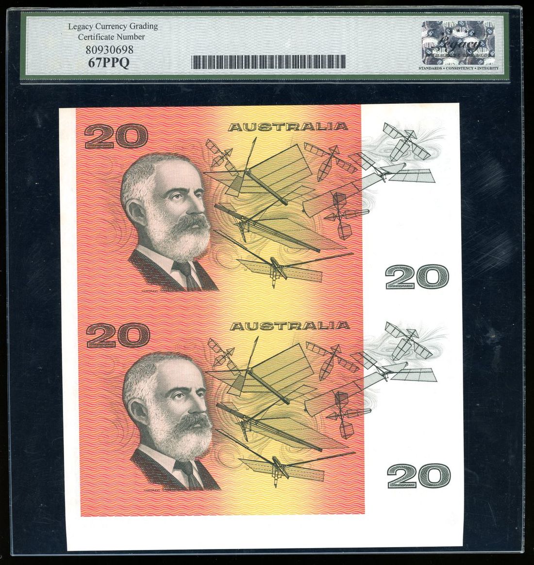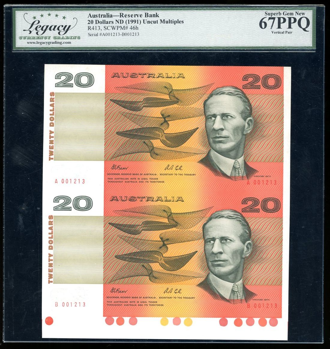 Reserve Bank of Australia, an uncut pair of $20, ND (1991), serial number A001214-B001213, (Pick 46h), LCG 67PPQ