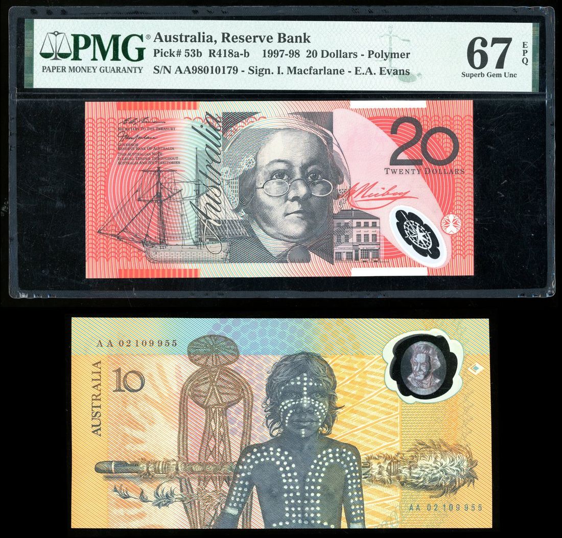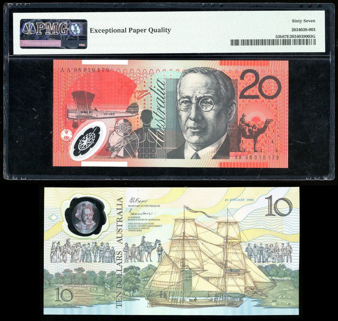 Reserve Bank of Australia, a pair, including $10 1988 and $20 1998, (Pick 49a, 53b), $10 as issued, $20 PMG 67EPQ (2)