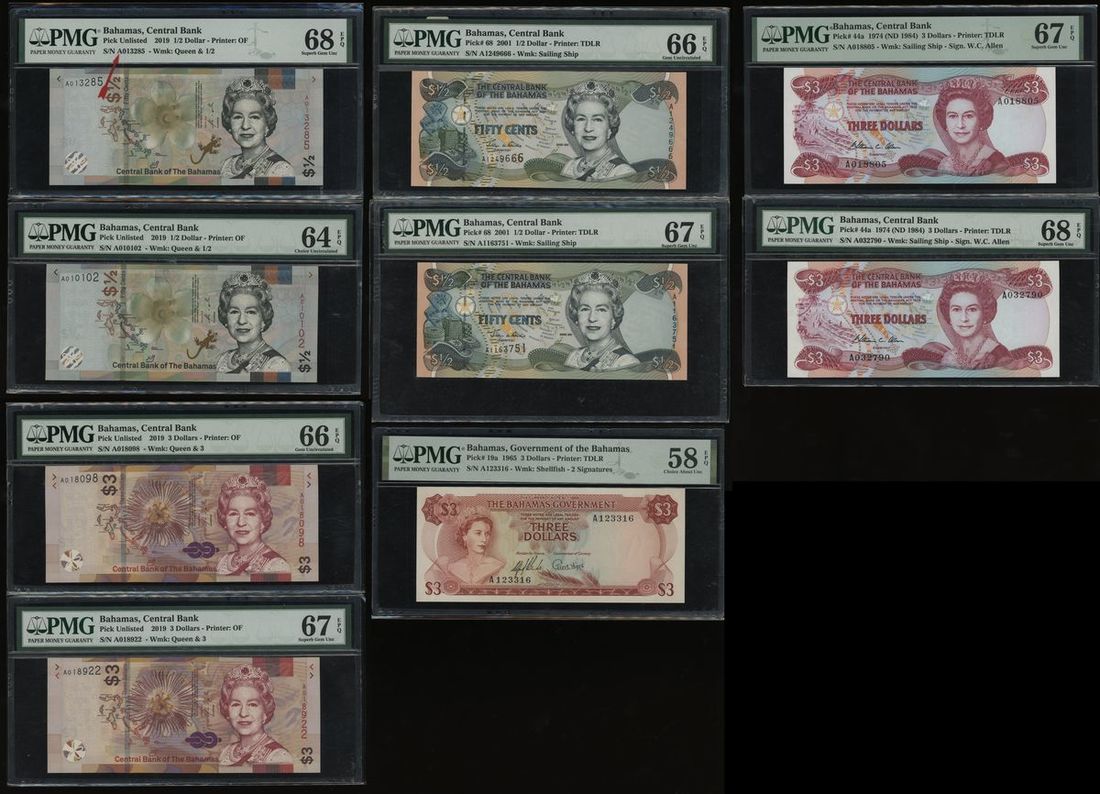 Central Bank of The Bahamas, a group of 8x, including: -2x $½, 2019, PMG 68EPQ and 64EPQ