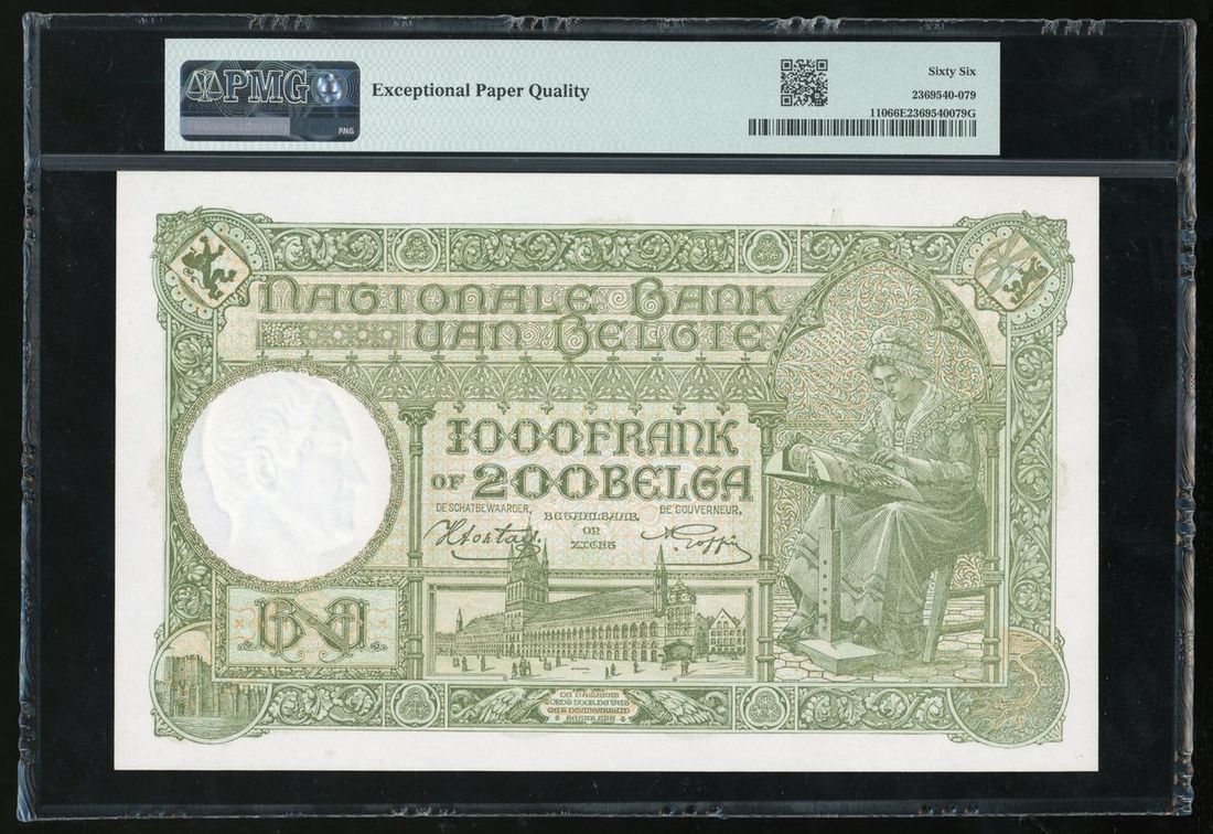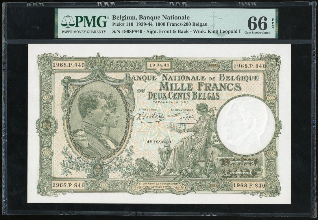 Banque Nationale de Belgique, Belgium, 1000 francs = 200 Belgas, 1943, serial number 1968.P.840, (Pick 110), PMG 66EPQ, third highest grade in the PMG population report, with one 8 finer as of writing