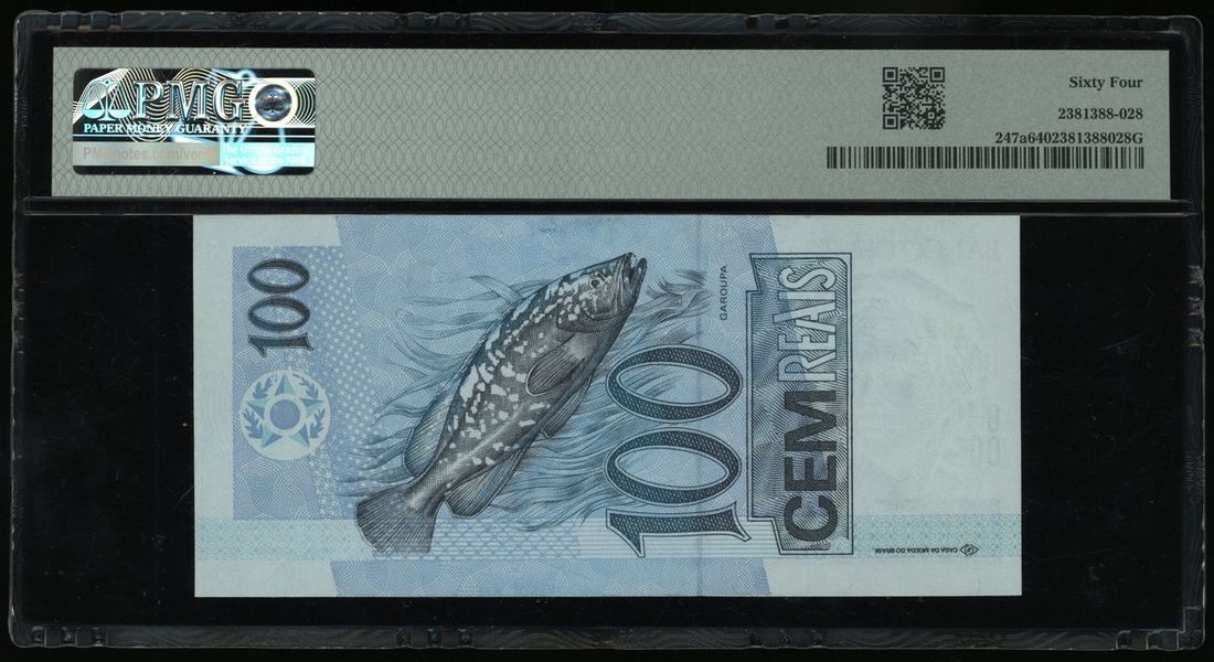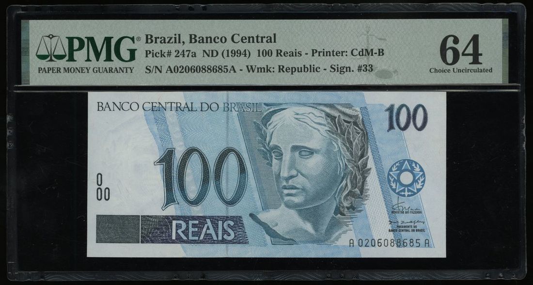 Brazil, 100 reais, ND(1994), serial number A0206088685A, (Pick 247a), PMG 64.