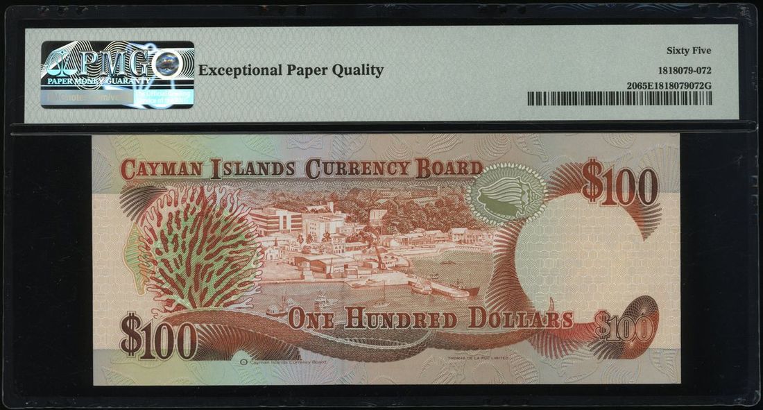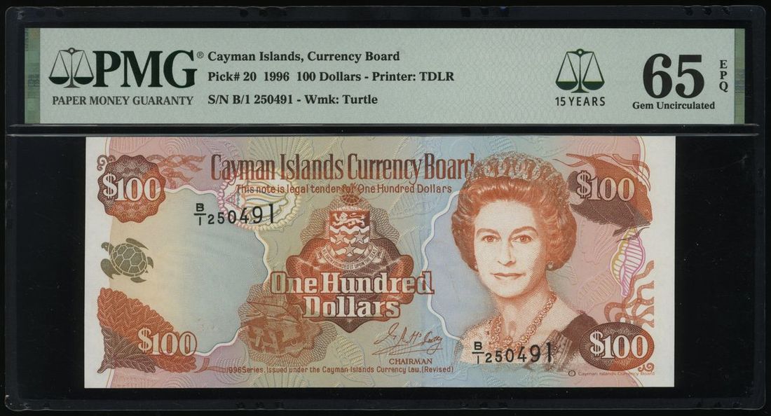 Cayman Islands Currency Board, $100, 1996, serial number B/1 250491, (Pick 20), PMG 65EPQ