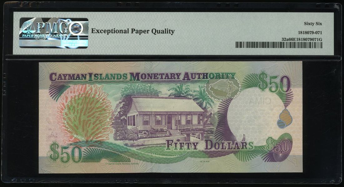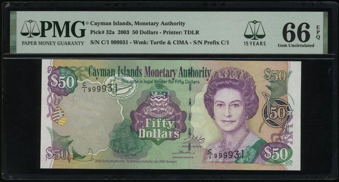 Cayman Islands Monetary Authority, $50, 2003, serial number C/1 999931, (Pick 32a), PMG 66EPQ