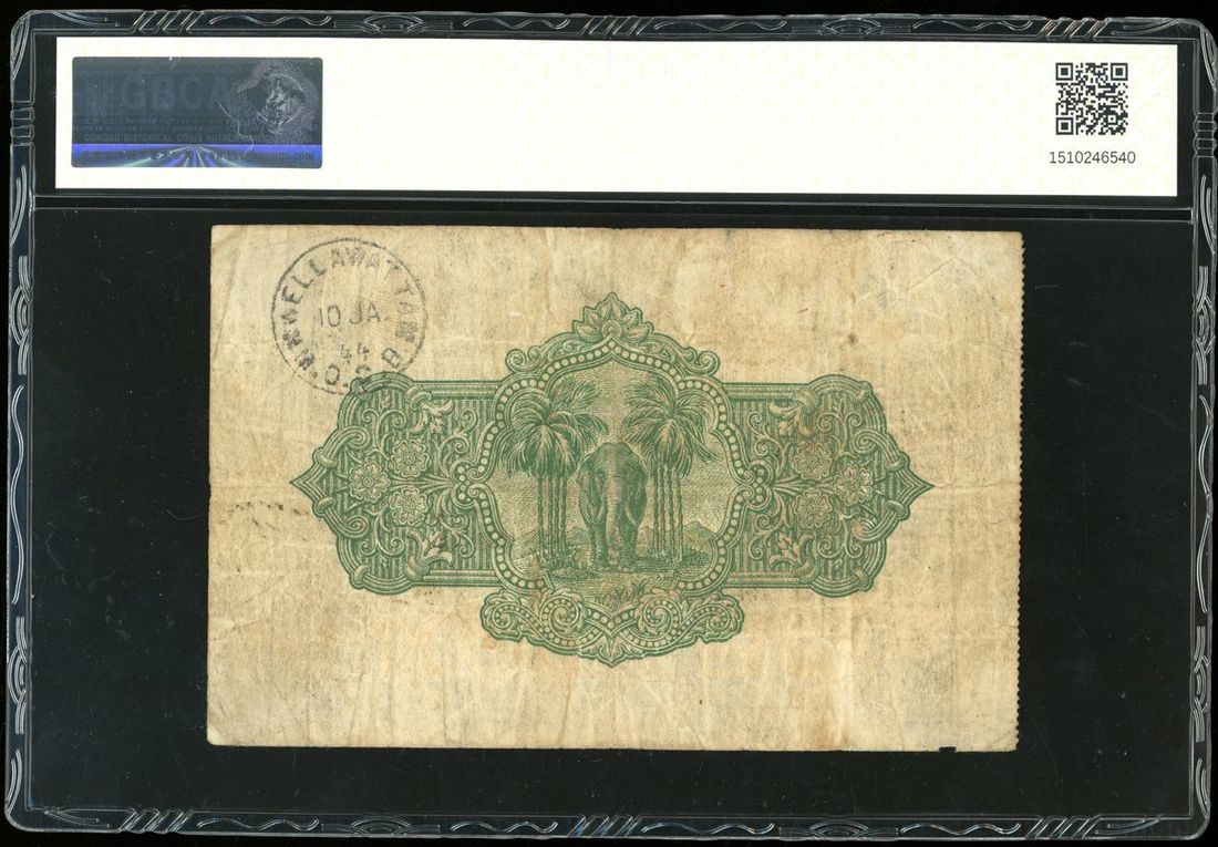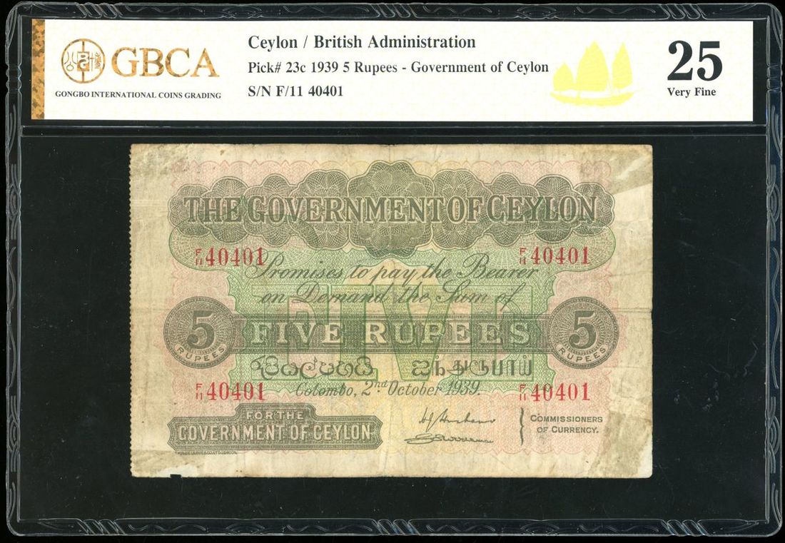 Government of Ceylon, 5 rupees, 2.10.1939, serial number F/11 40401, (Pick 23c), GBCA 25