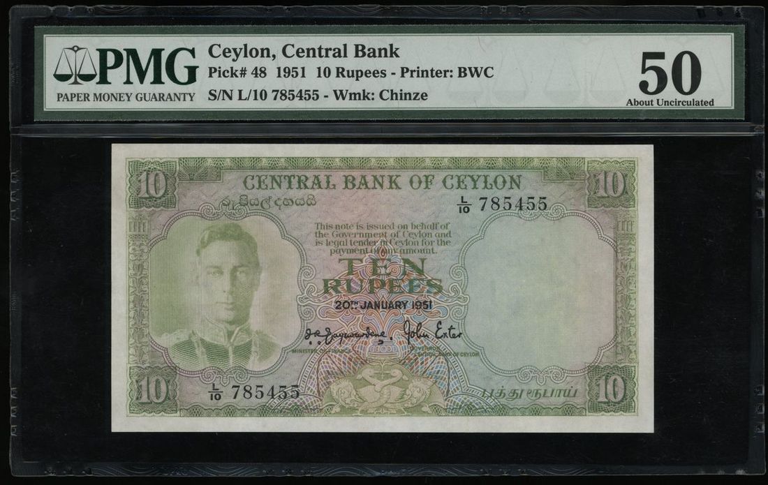 Ceylon, 10 rupees, 1951, serial number L/10 785455, (Pick 48), PMG50.