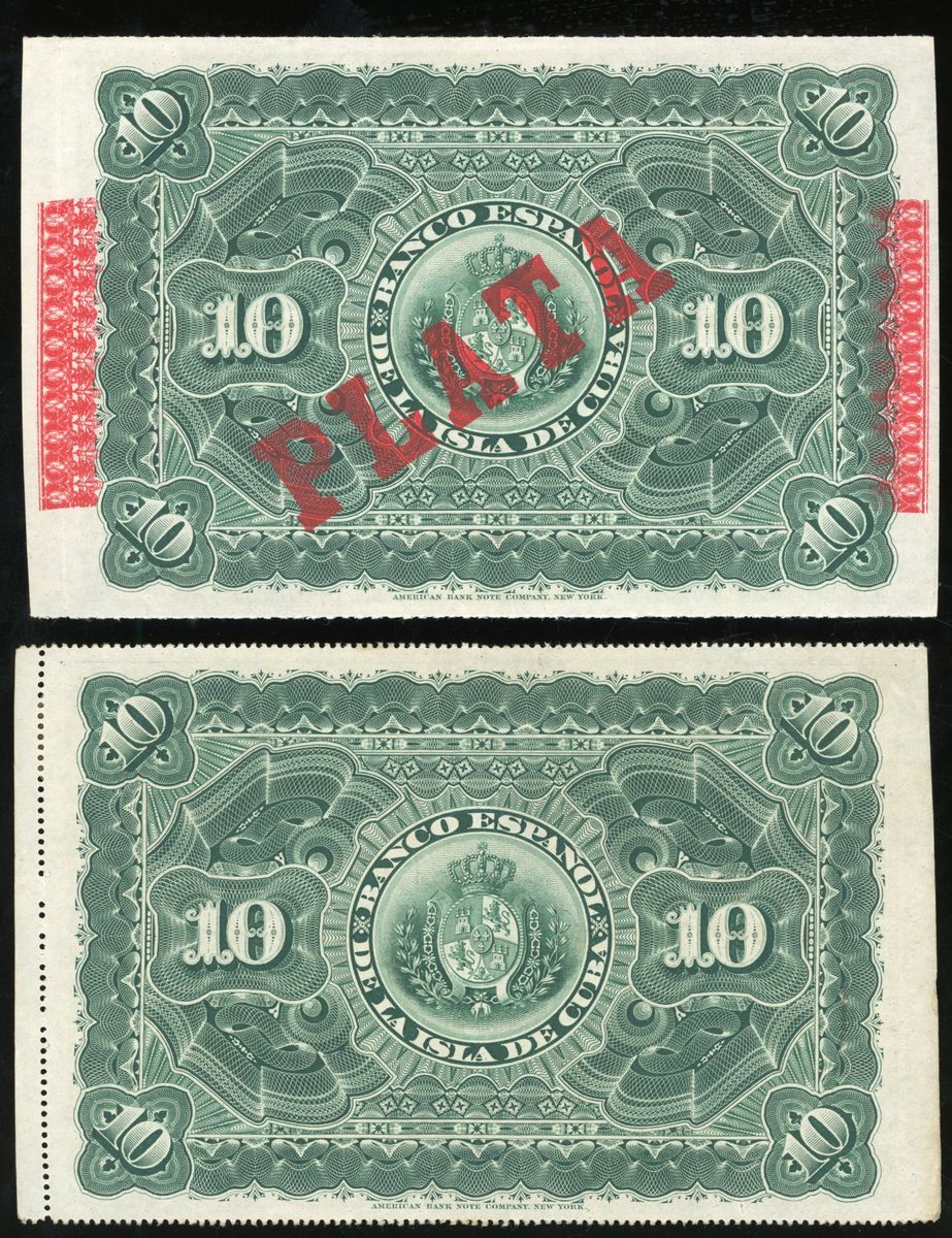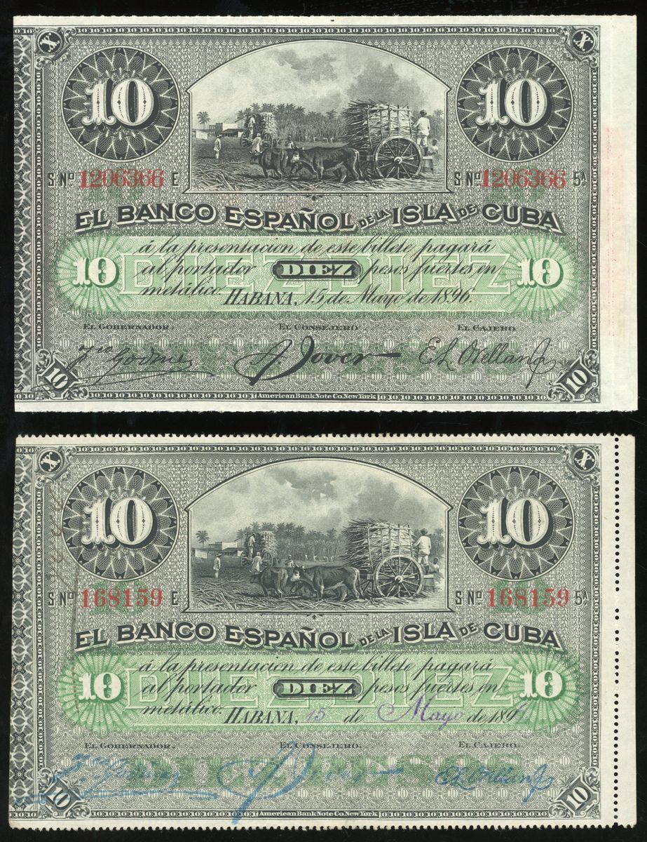 Banco Español de la Isla de Cuba, a pair of 10 pesos, 1896, serial numbers 168159 and 1206366, one with partially printed date, the other full printed date with 'PLATA' overprint on reverse,