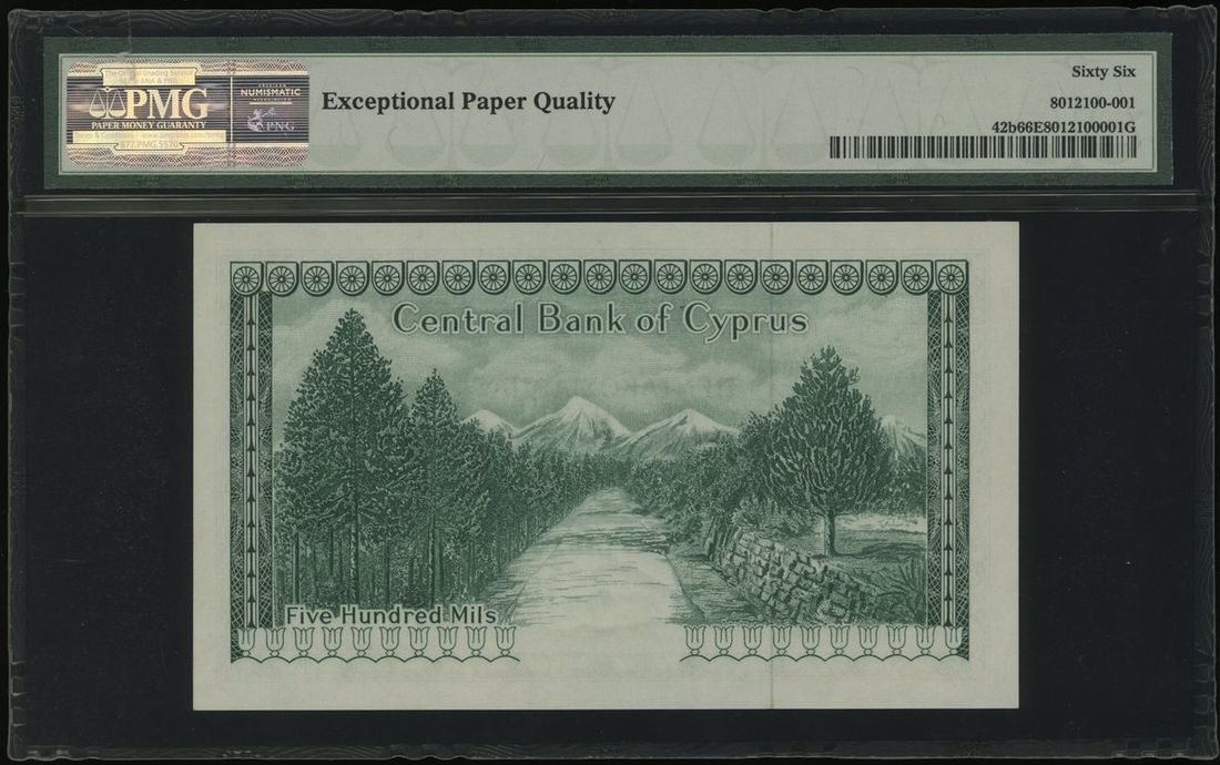 Central Bank of Cyprus, 500 mils, 1974, serial number I/32 033497, (Pick 42b), PMG 66EPQ Gem Uncirculated, third highest grade in the PMG population report