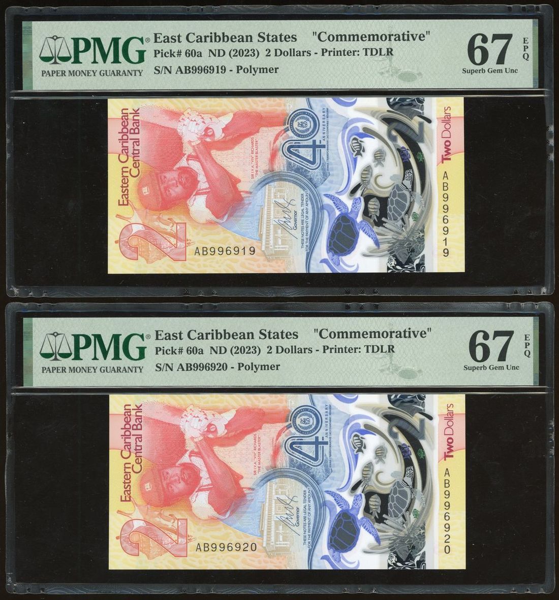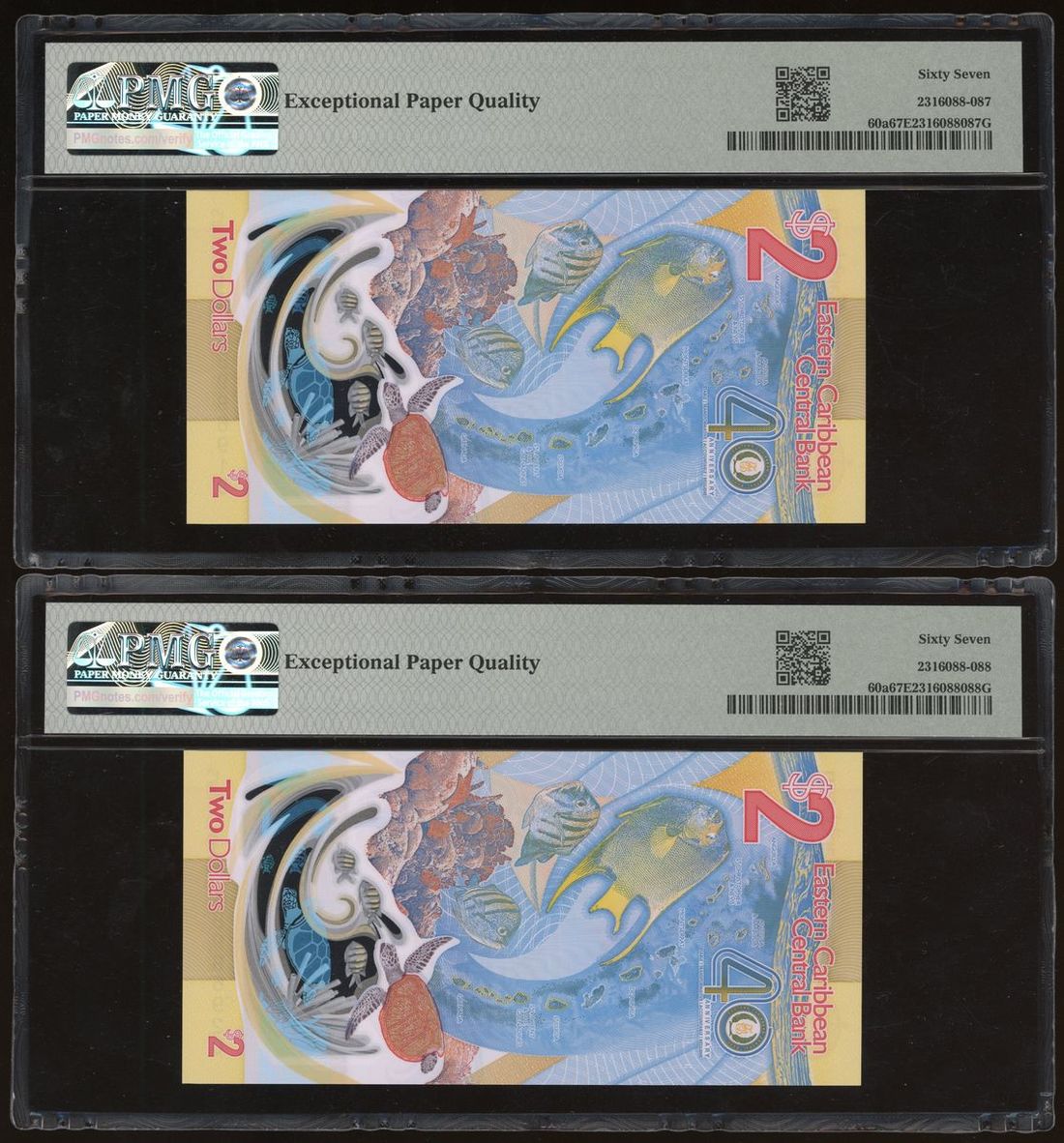 East Caribbean Central Bank, consecutive pair 2 dollar, ND (2023), serial number AB996919, AB996920, (Pick 60a), both PMG 67EPQ (2)