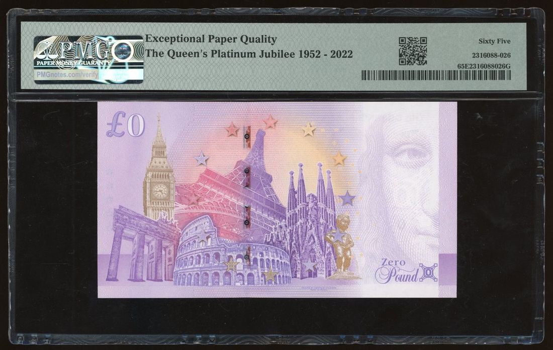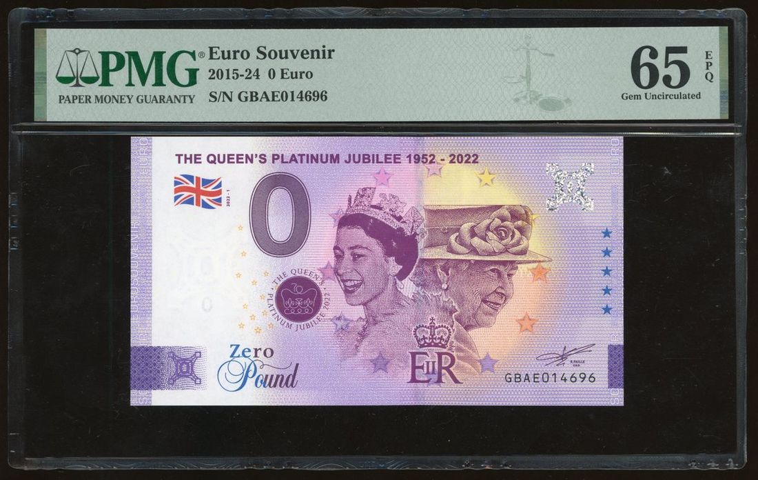Euro Souvenir, 0 Euro, 2015-24, The Queen's Platinum Jubilee 1952-2022, serial number GBAE014696, PMG 65EPQ
