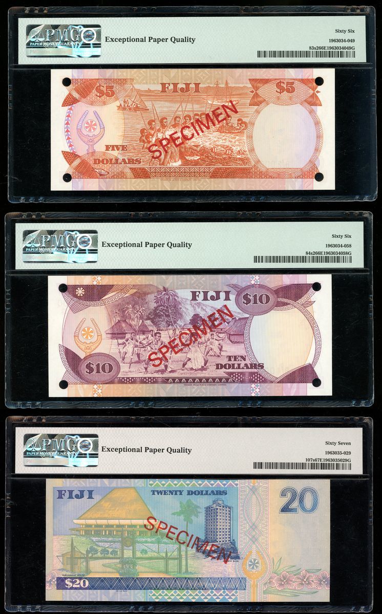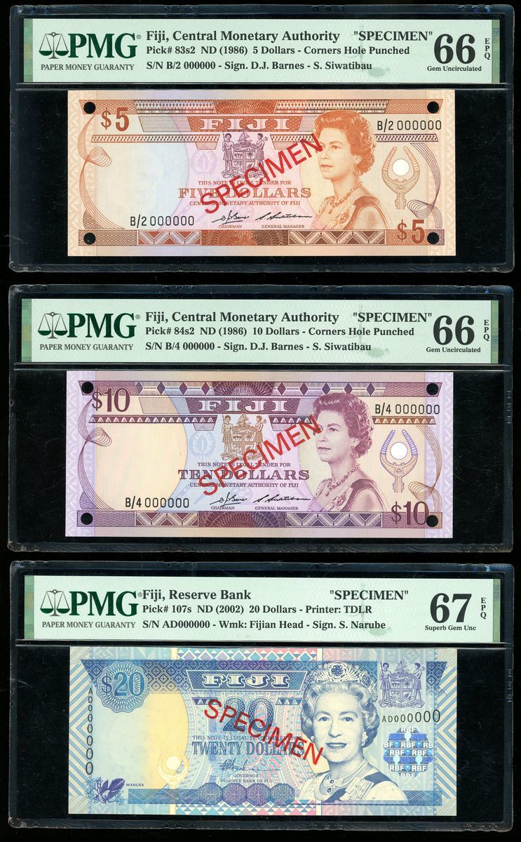 Reserve Bank of Fiji, a group of 3x specimens, including 1986 $5 and $10, 2002 $20, (Pick 83s2, 84s2, 107s), PMG 66EPQ, 66EPQ and 67EPQ respectively (3)