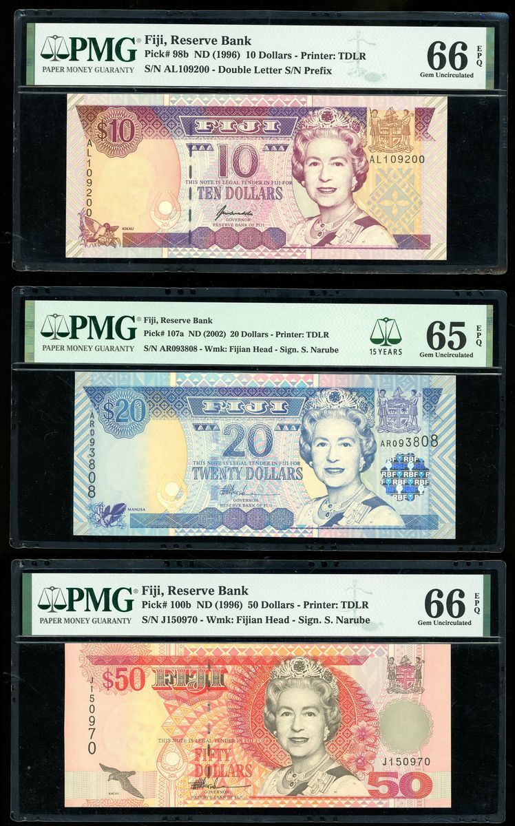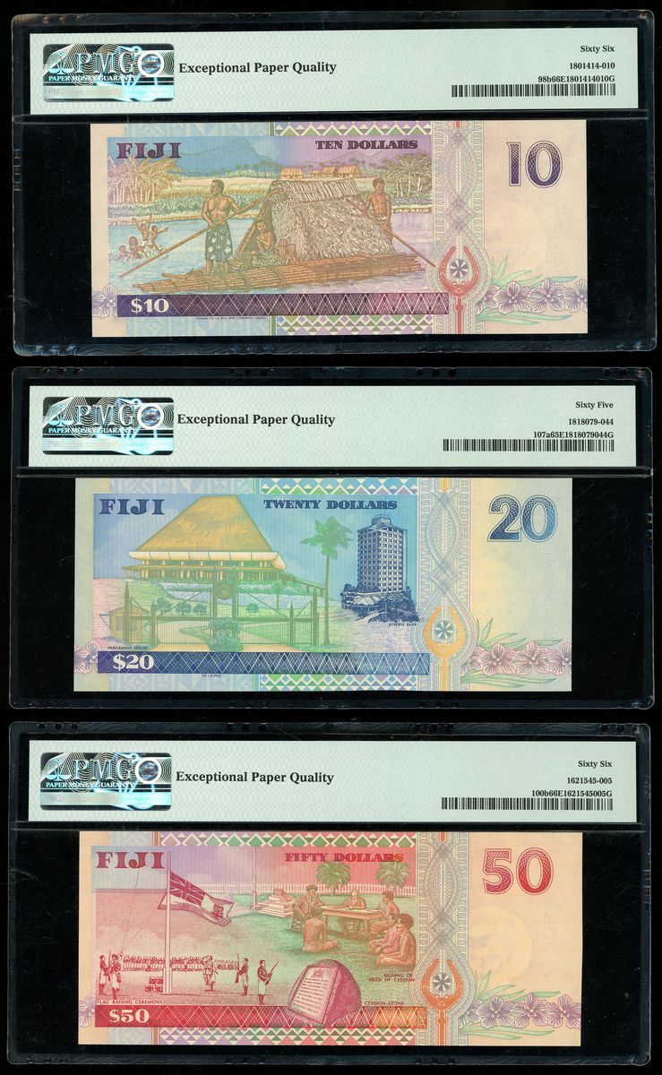 Reserve Bank of Fiji, a group of 3x, including 1996 $10 and $50, 2002 $20, (Pick 98b, 100b, 107a), PMG 66EPQ, 66EPQ and 65EPQ respectively (3)