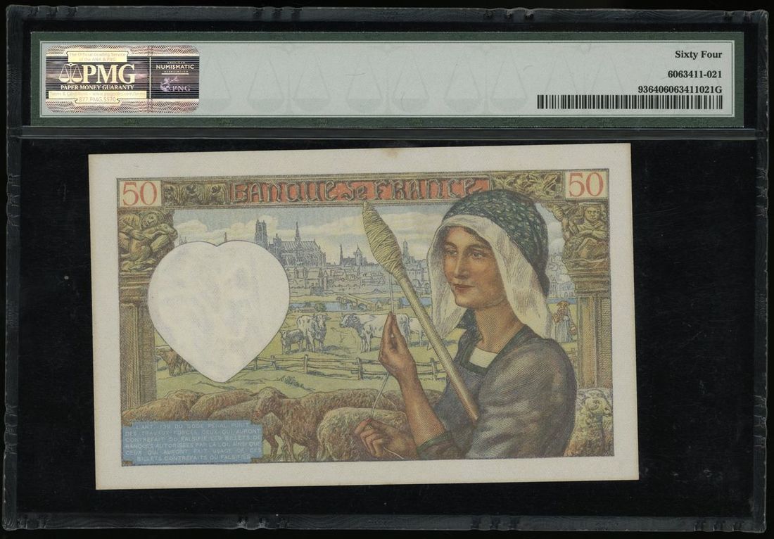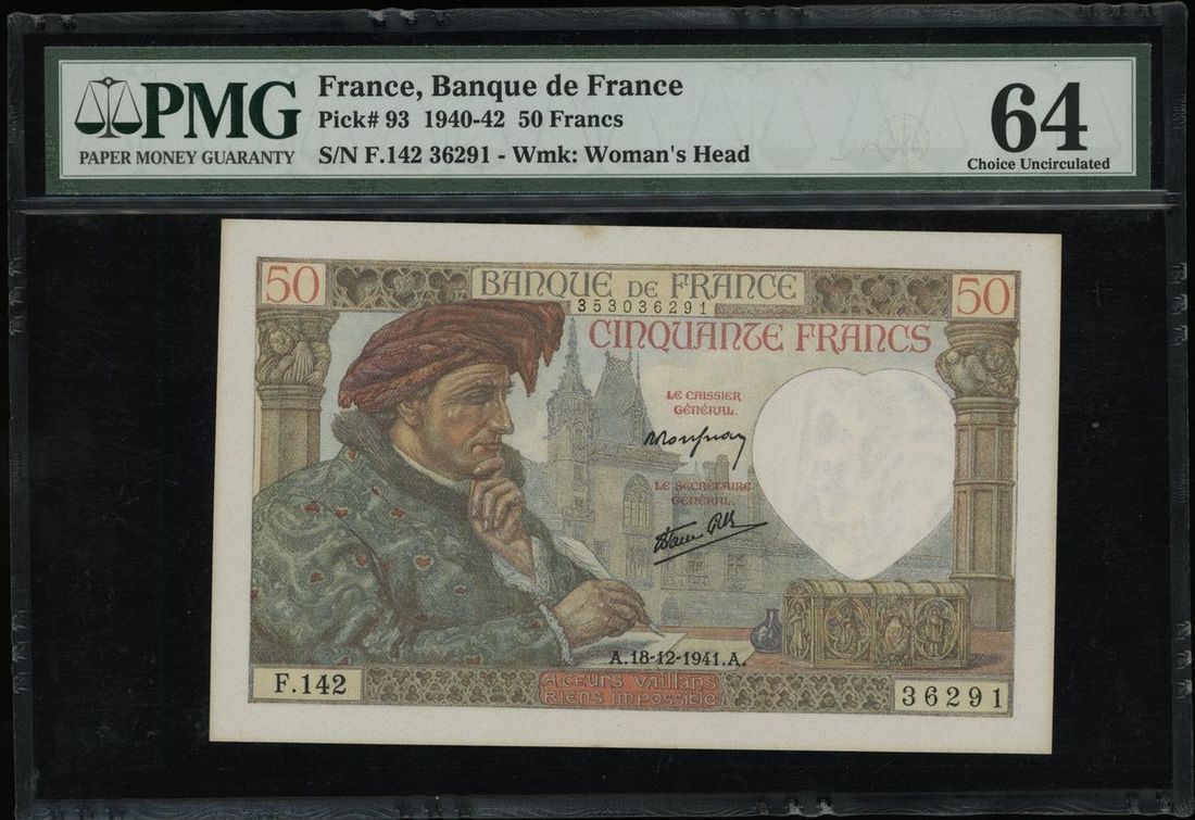 Banque de France, 50 francs, 1941, serial number F.142 36291, (Pick 93), PMG 64.