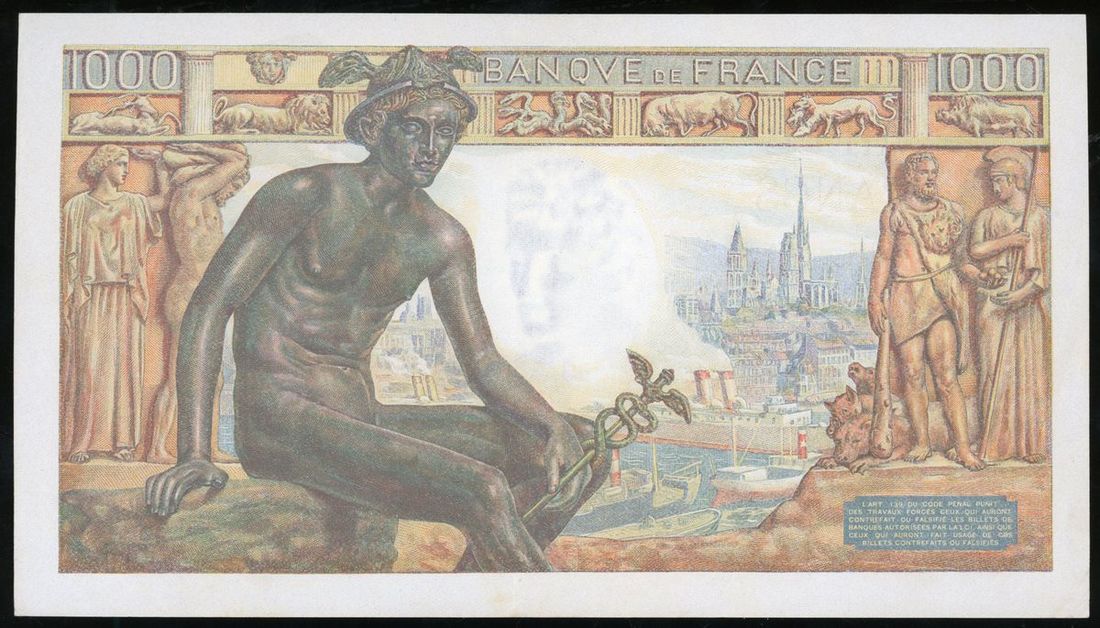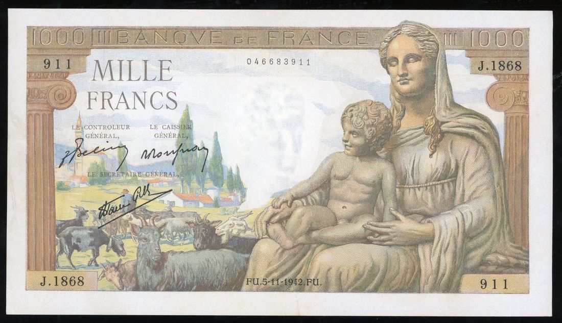 Banque de France, 1000 francs, 1942, serial number J.1868 911, 'Déesse Déméter',