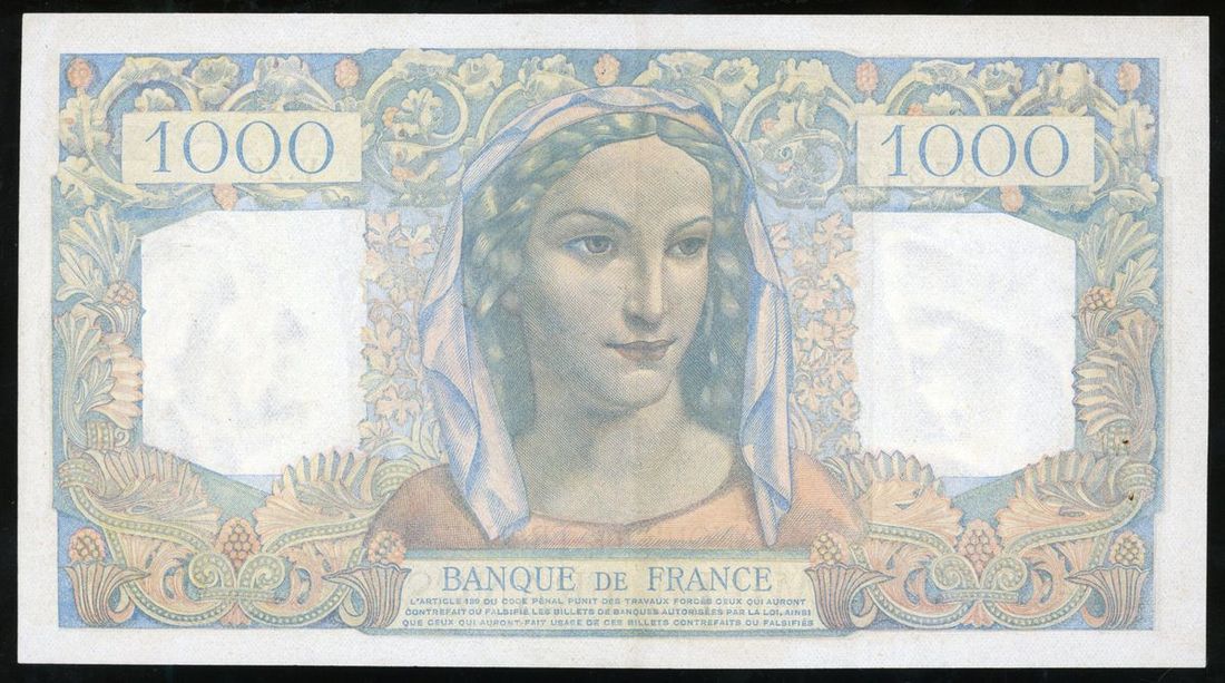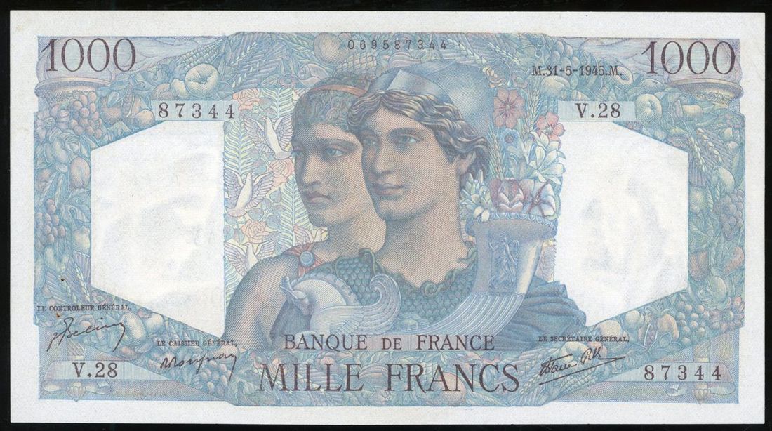 Banque de France, 1000 francs, 1945, serial number V.28 87344, 'Minerve et Hercule',