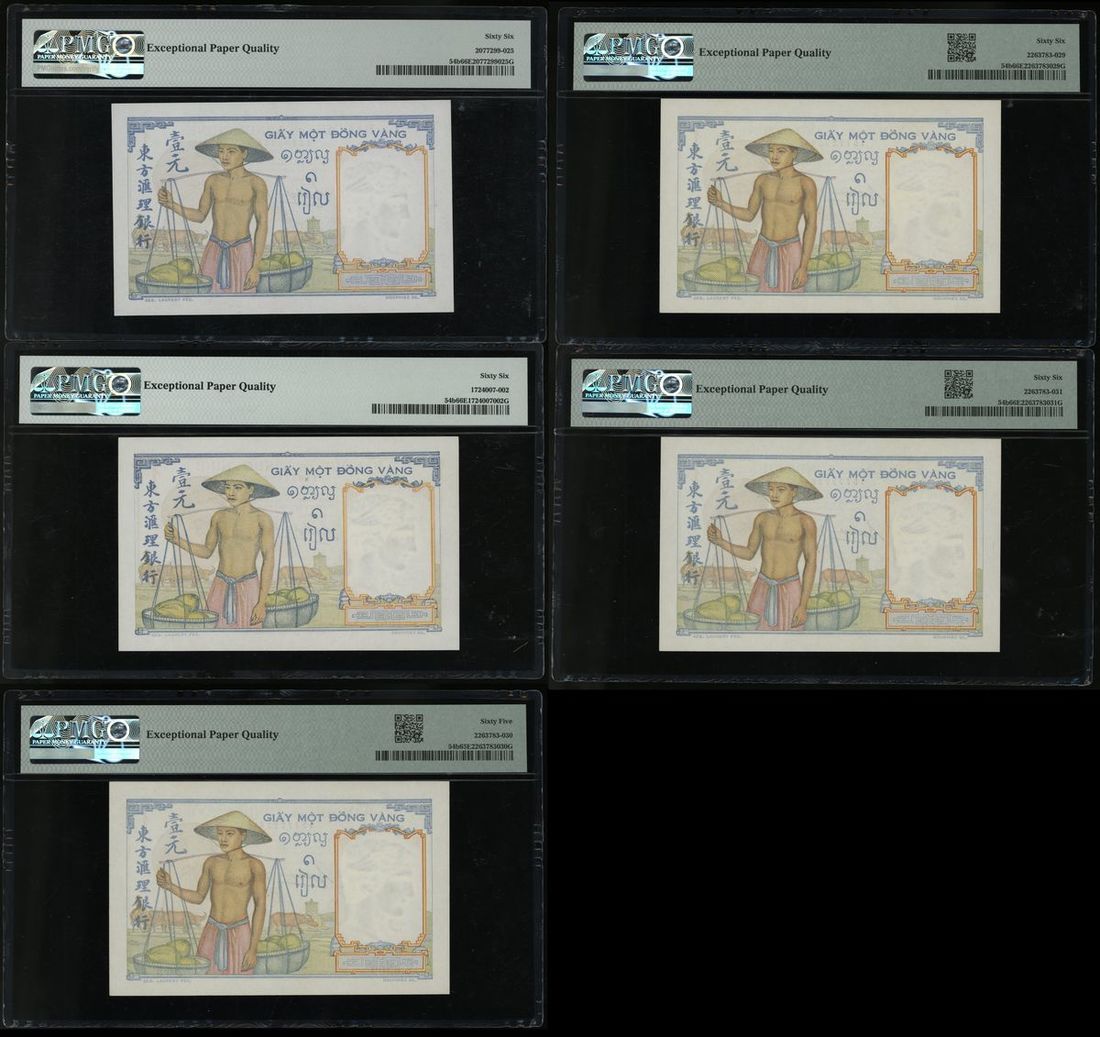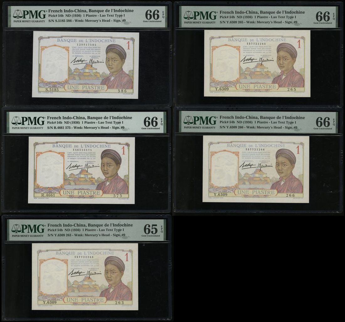 Banque de l'Indo-Chine, French Indo China, a group of 5x 1 piastre, ND (1936), text on reverse in Old Lao,