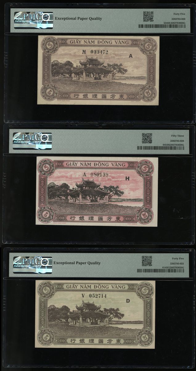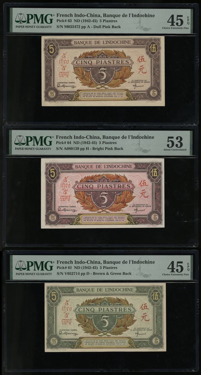 Banque de l'Indo-Chine, French Indo China, a trio of 5 piastres, ND (1942-1945), serial numbers V 052714, M 033472 and A 080139, in green, plum and pink,