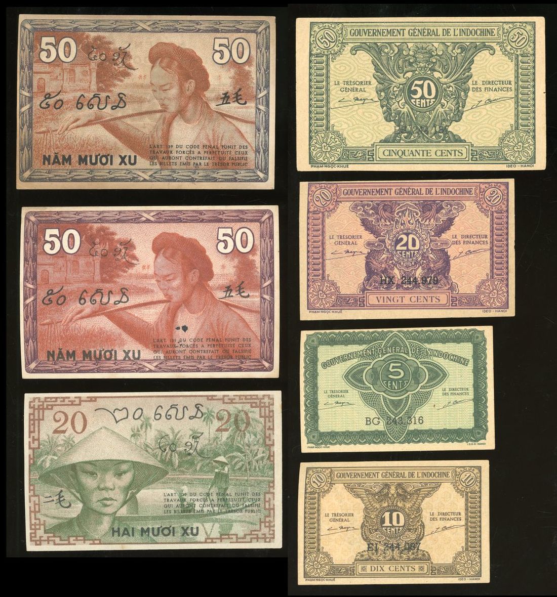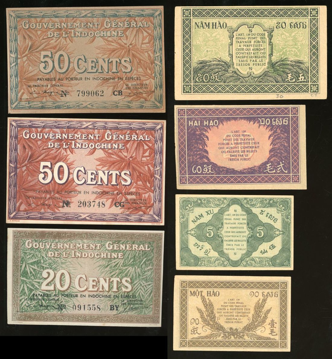 Gouvernement Général de l'Indochine, French Indochina, a group of 7x, including: 20 cents, 2x 50 cents, 5 cents, 10 cents, 20 cents and 50 cents,