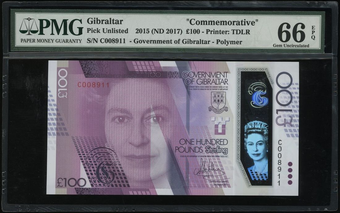 Government of Gibraltar, commemorative polymer £100, 2015 ND (2017), serial number C008911, PMG 66EPQ.