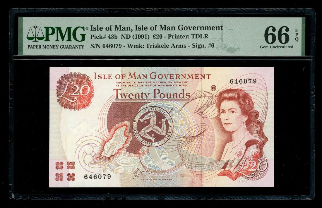 Isle of Man Government, £20, ND(1991), serial number 646079, Elizabeth II at right,