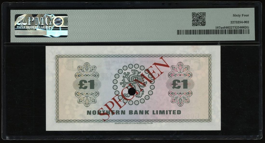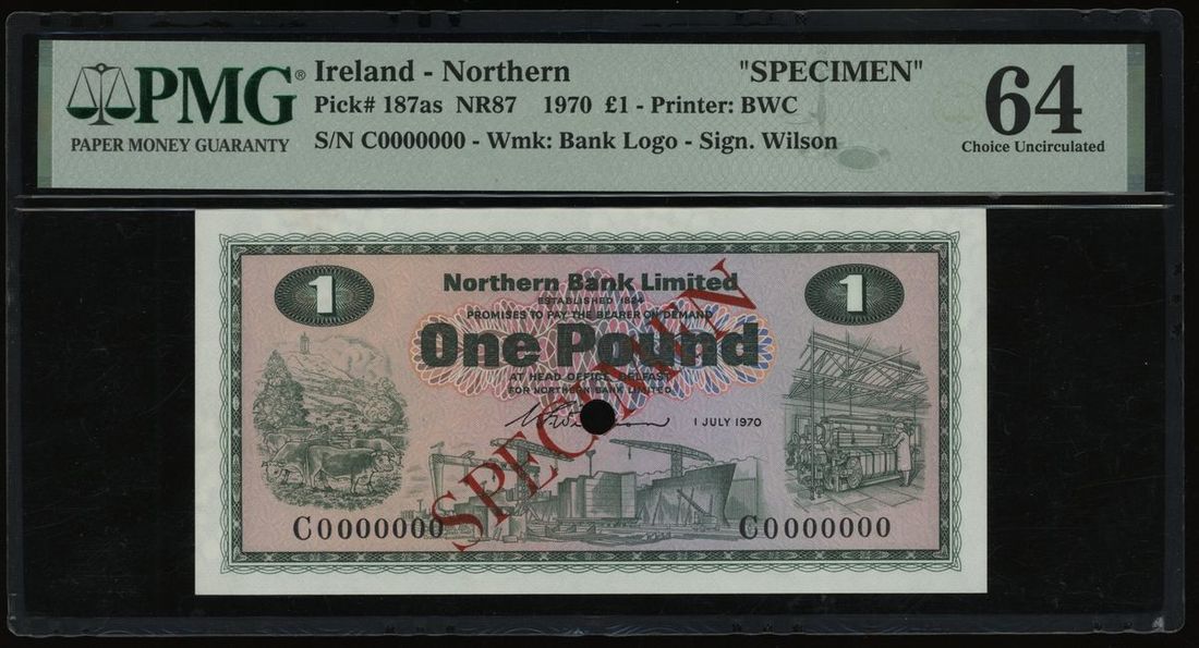 Northern Bank Limited, Northern Ireland, £1, 1970, Specimen, serial number C0000000, (Pick 187as), PMG 64.