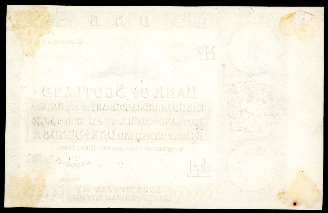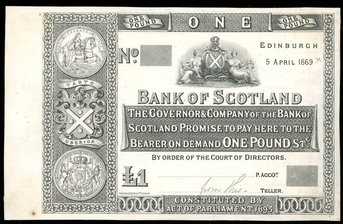 Bank of Scotland, uniface black and white proof for £1, 5.4.1869, no serial numbers, printed by Perkins Bacon & Co.,
