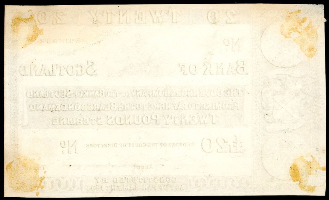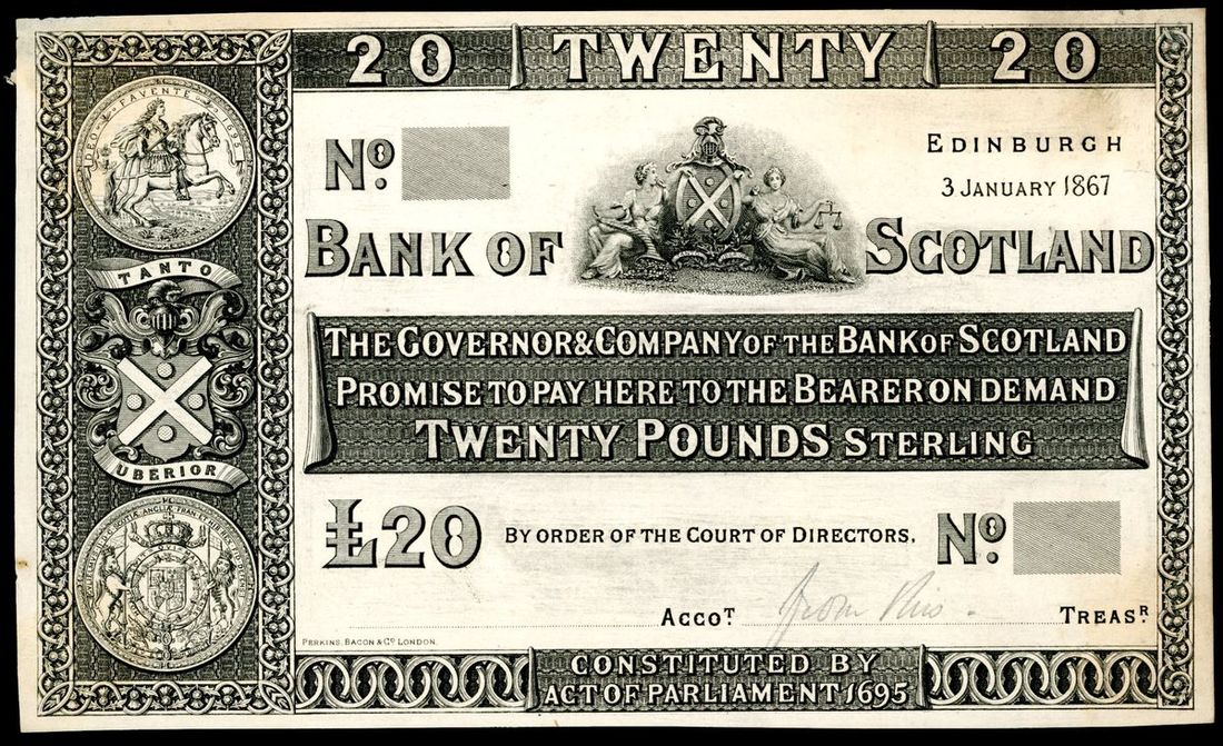 Bank of Scotland, uniface black and white proof for £20, 3.1.1867, no serial numbers, printed by Perkins, Bacon & Co. ,