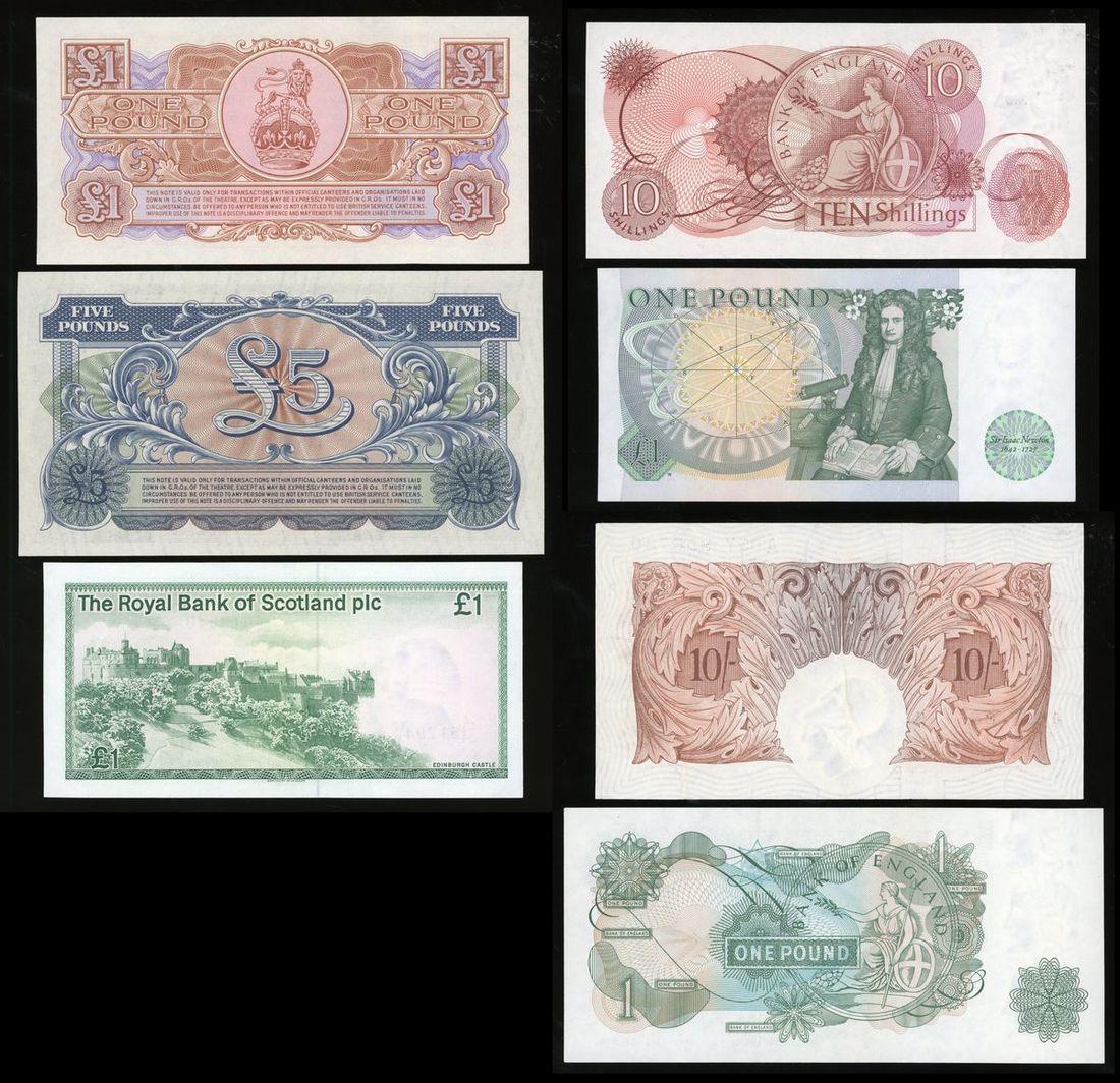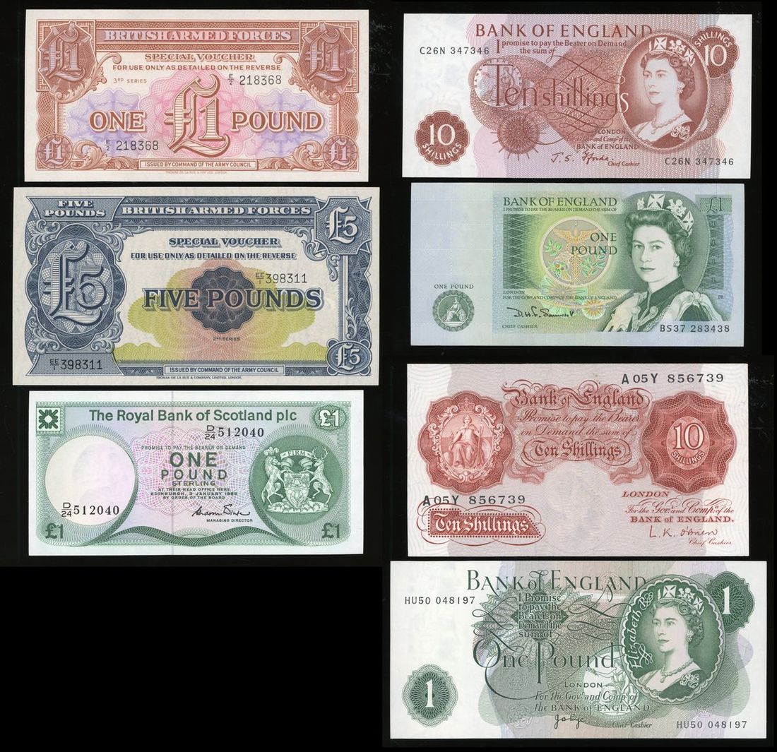 Great Britain, a group of 7, including: British Armed Forces 1956 1 pound and 1948 5 pounds; The Royal Bank of Scotland plc 1985 1 pound; Bank of England L. K. O'Brien signed 10 shillings, J. B. Page signed 1 pound; J. S. Fforde signed 10 shillings, D. H. F. Somerset signed 1 pound;