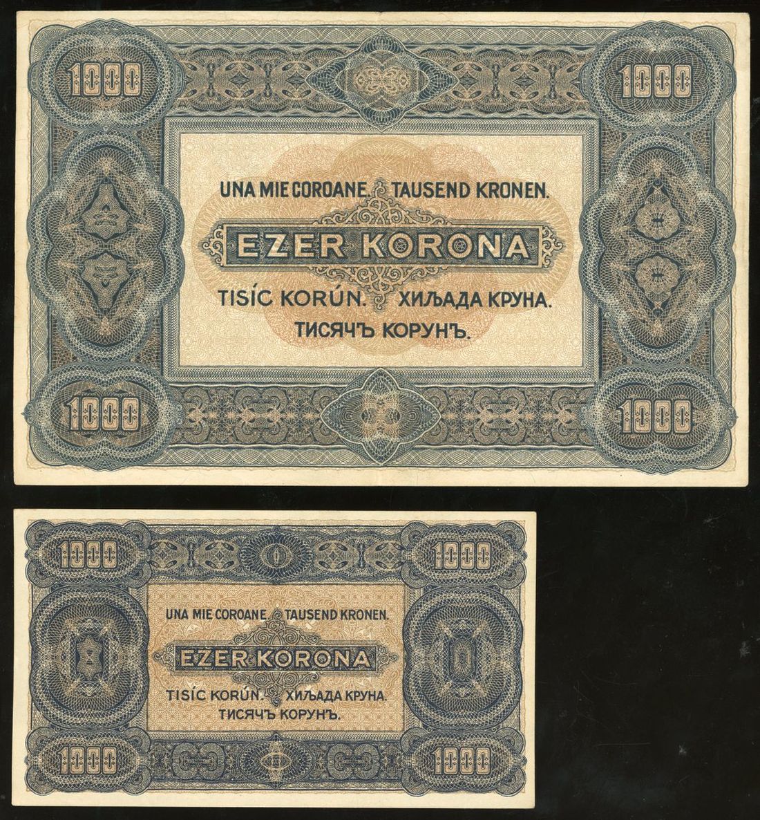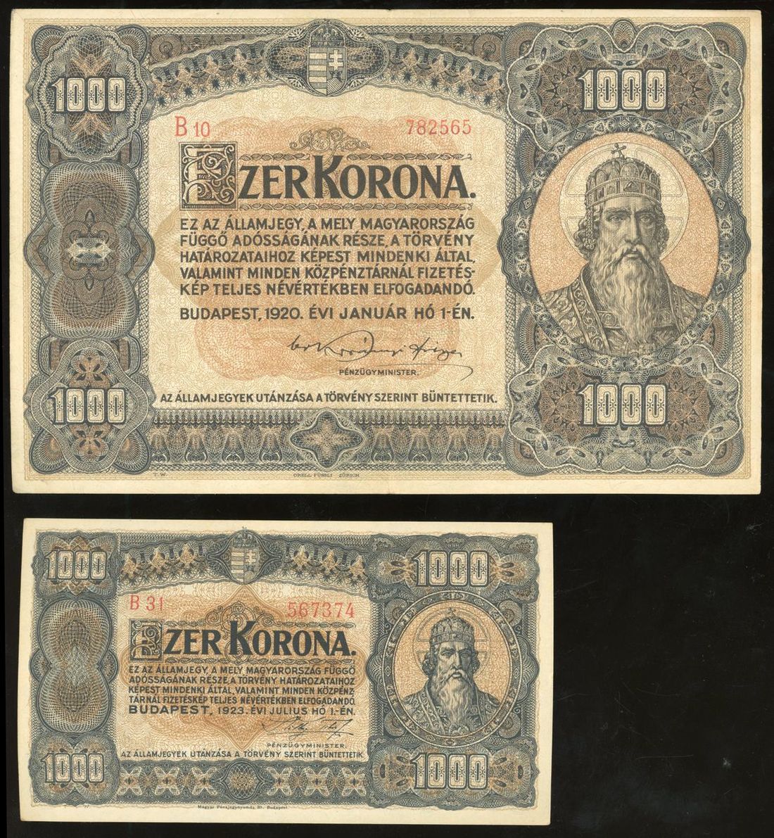 Pénzügyminisztérium, Hungary, a pair of 1000 koronas, 1920 and 1923, serial numbers B10 782565 and B31 567374, (Pick 66, 75), Extremely Fine and Uncirculated (2)