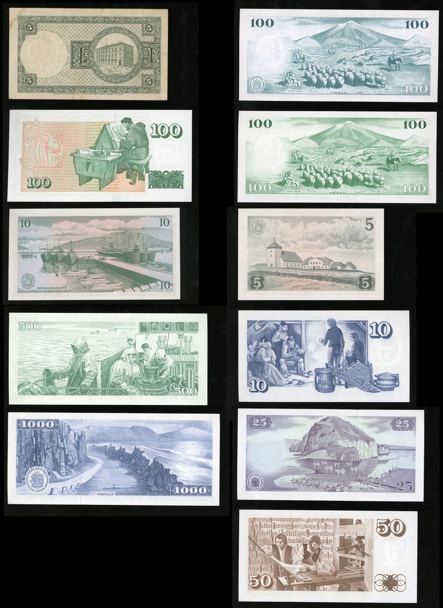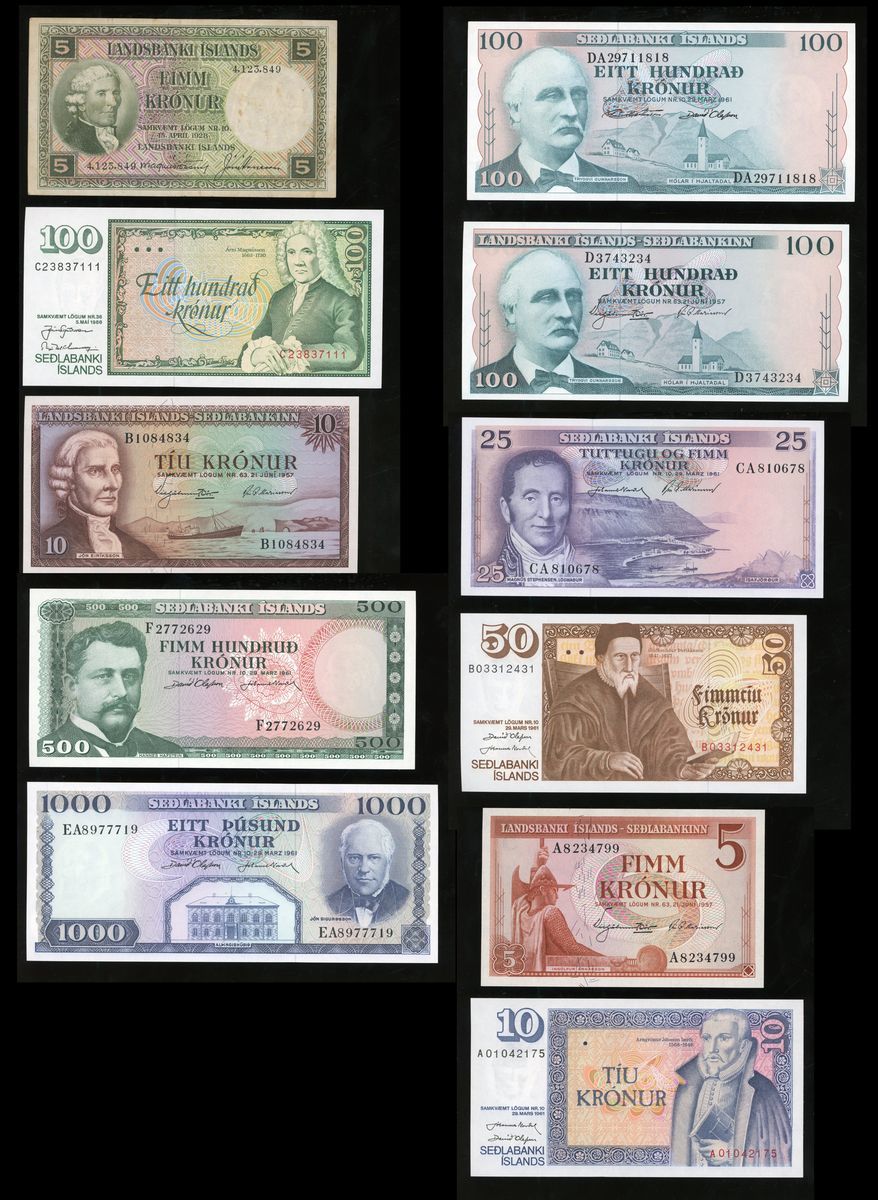 Landsbanki Íslands / Seðlabanki Íslands, Iceland, a group of 11x, including: 1928 5 kronur; 1957 5, 10 and 100 kronur; 1961 100 kronur; 1961 10, 25, 50, 500 and 1000 kronur; 1986 100 kronur;
