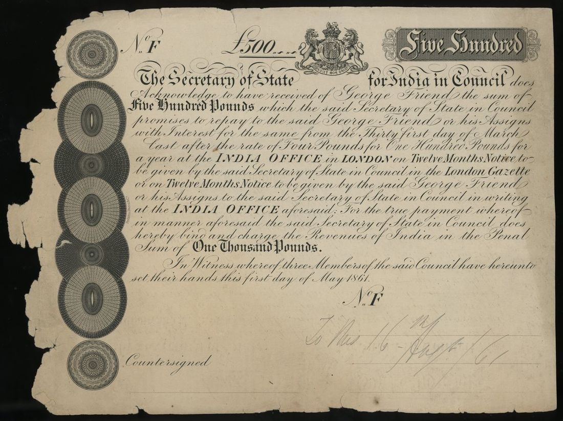 Secretary of State for India in Council, £500 bond, 1861, no serial number, 27.5 x 20.3 cm,