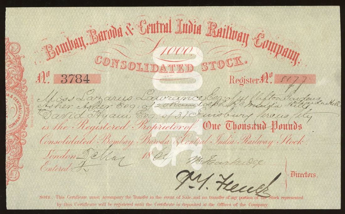 Bombay, Baroda and Central India Railway, India, £1000 consolidated stock, 20.5.1864, serial number 3784, good very fine. The company built the first suburban railway in India. Quite rare and interesting