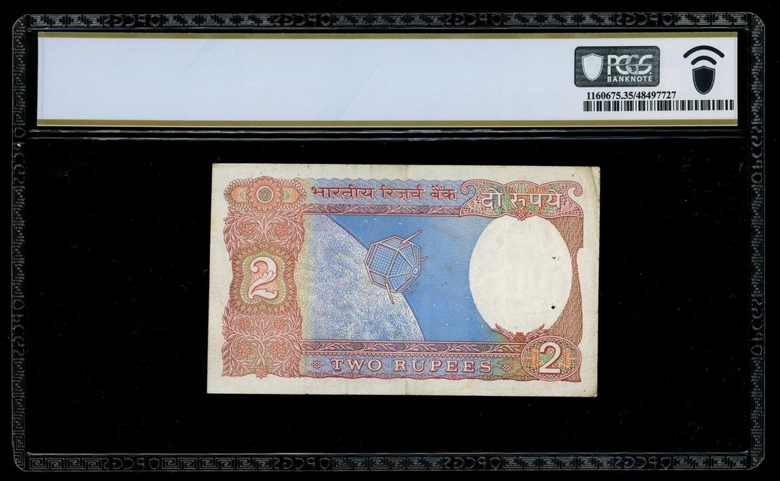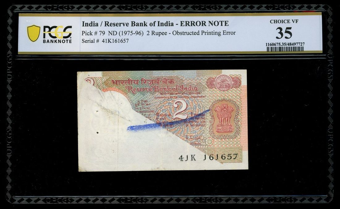 Reserve Bank of India, ERROR 2 rupees, ND(1975-96), serial number 41K 161657, obstructed printing error,