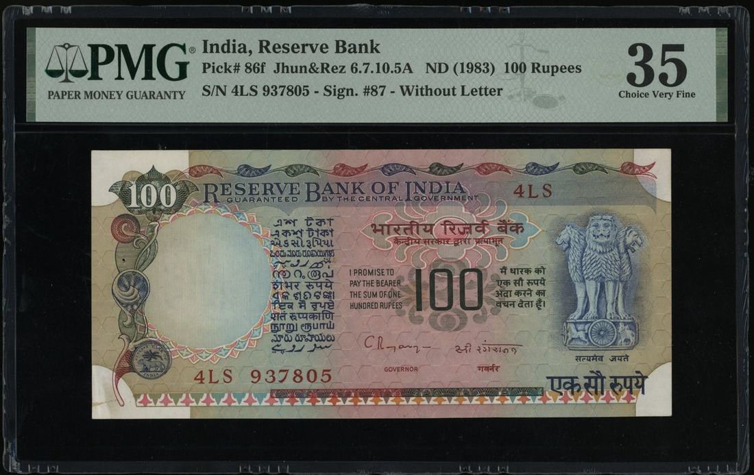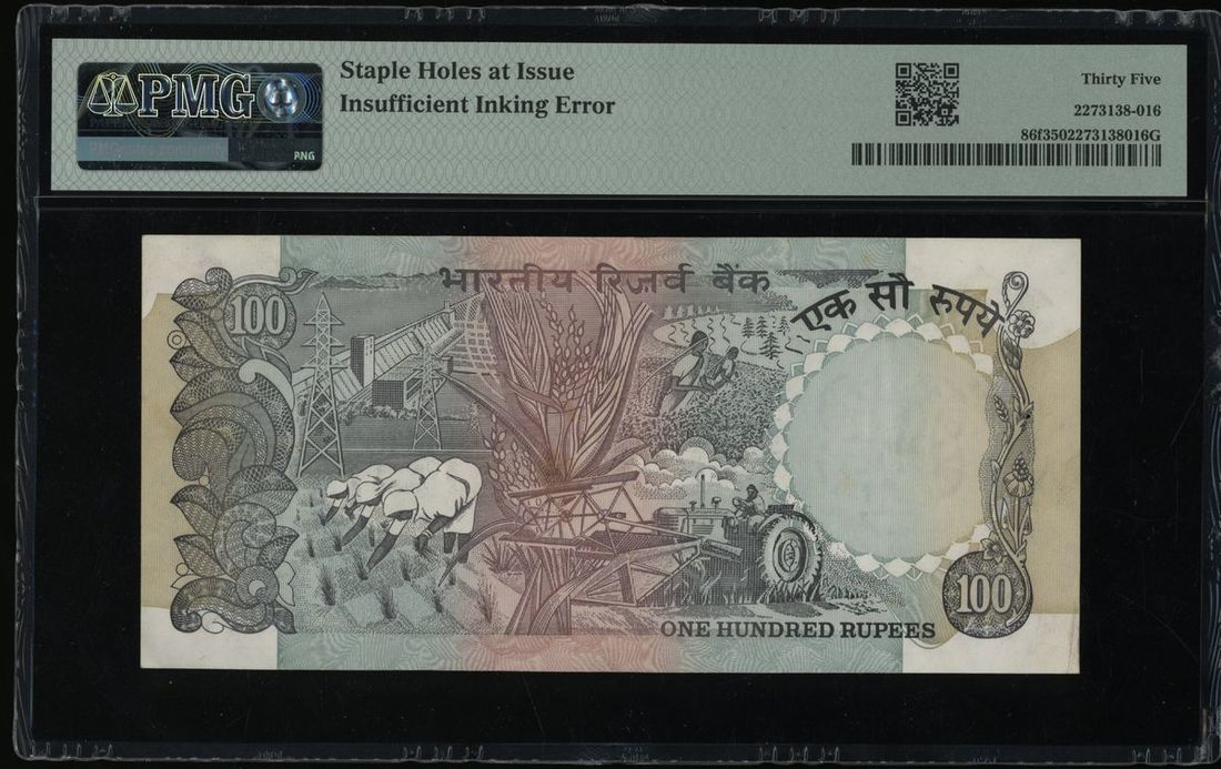 Reserve Bank of India, ERROR 100 rupees, ND(1983), serial number 4LS 937805, insufficient inking error, missing top right serial number,