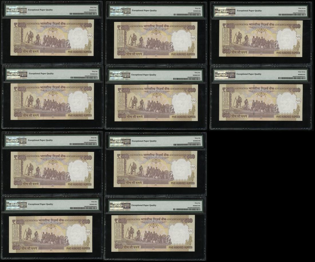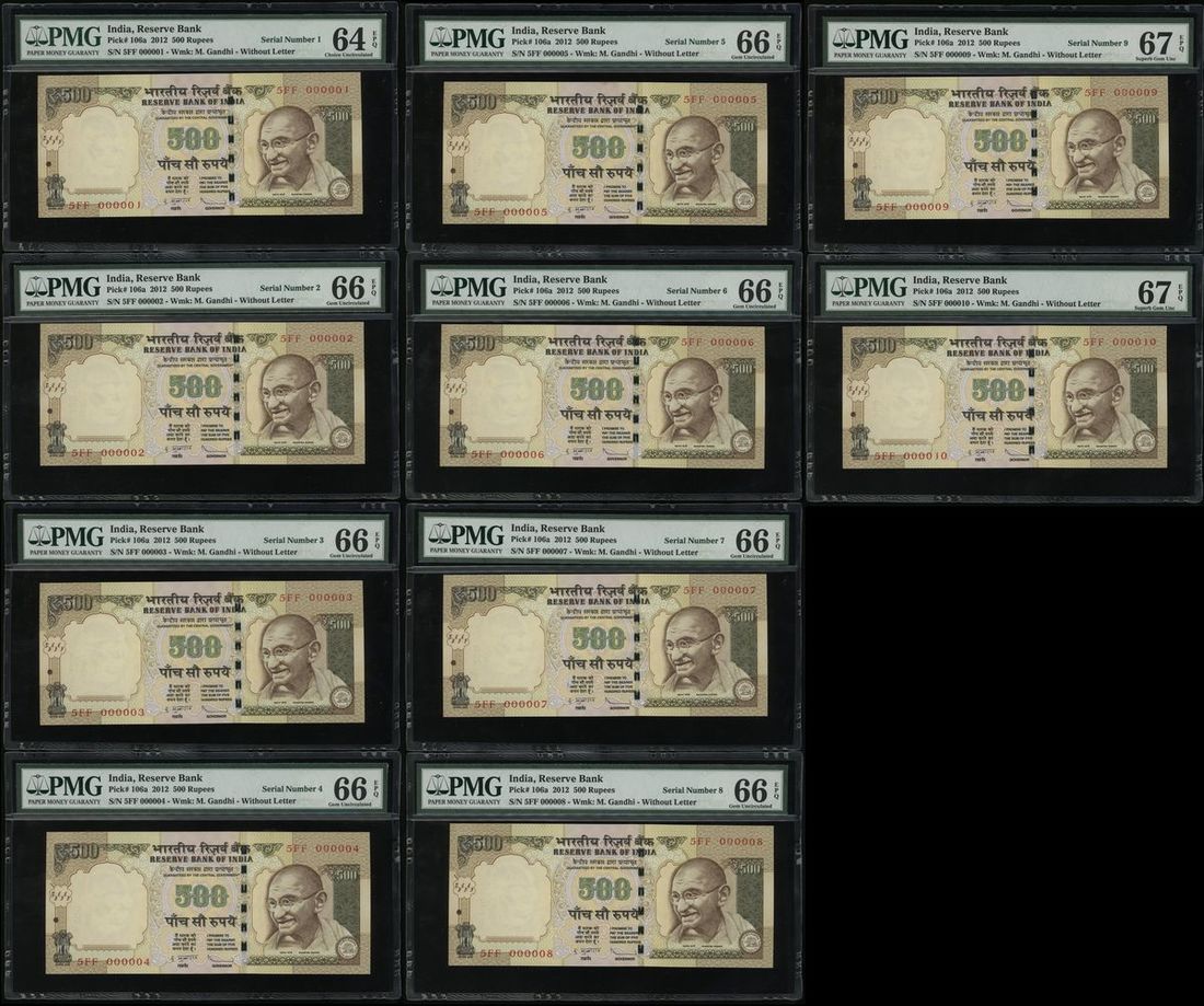 2012年印度儲備銀行500盧比一組10枚,細編號5FF 000001-10,首枚評級PMG 64EPQ,最後2枚評級PMG 67EPQ,其餘均為PMG 66EPQ