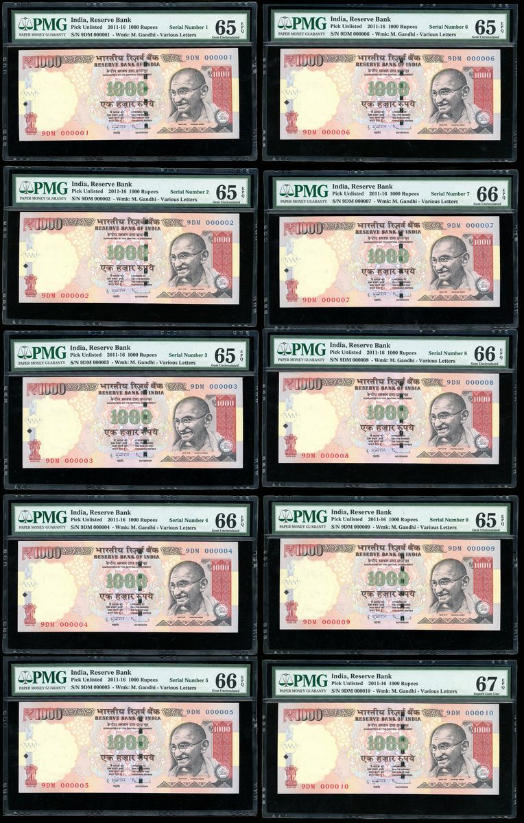 Reserve Bank of India, consecutive 1000 rupees (10), 2013, low serial number 9DM 000001-10, PMG 65-67EPQ (10)