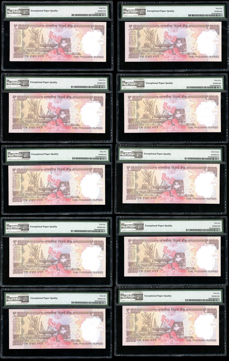 2013年印度儲備銀行1000盧比一組10枚,細編號9DM 000001-10,評級為PMG 65-67EPQ