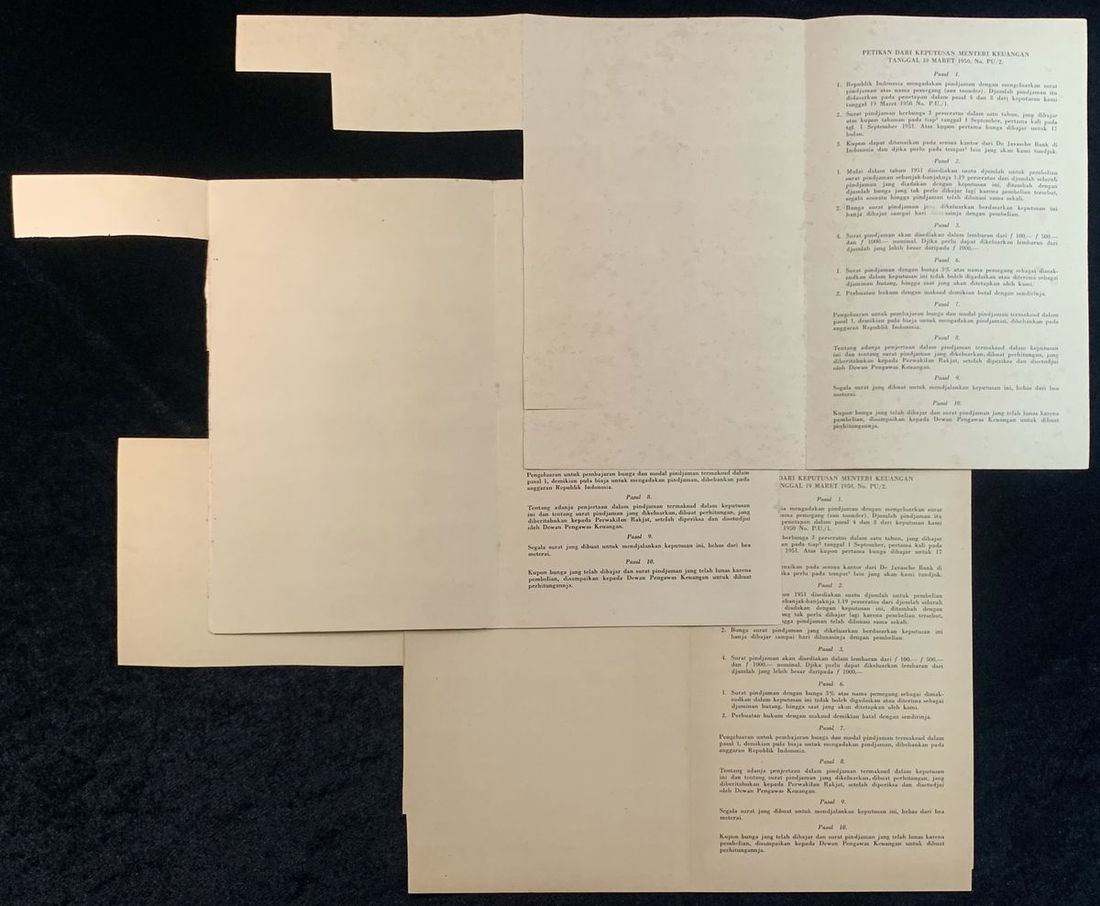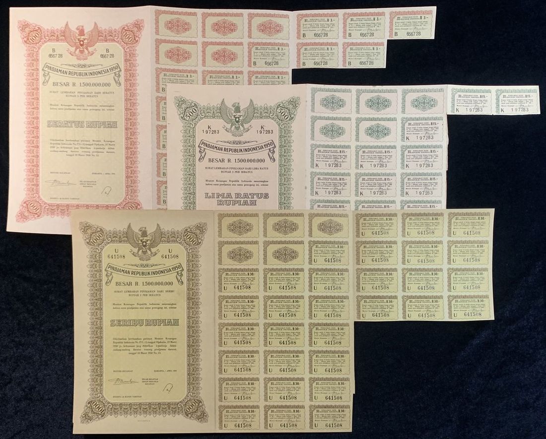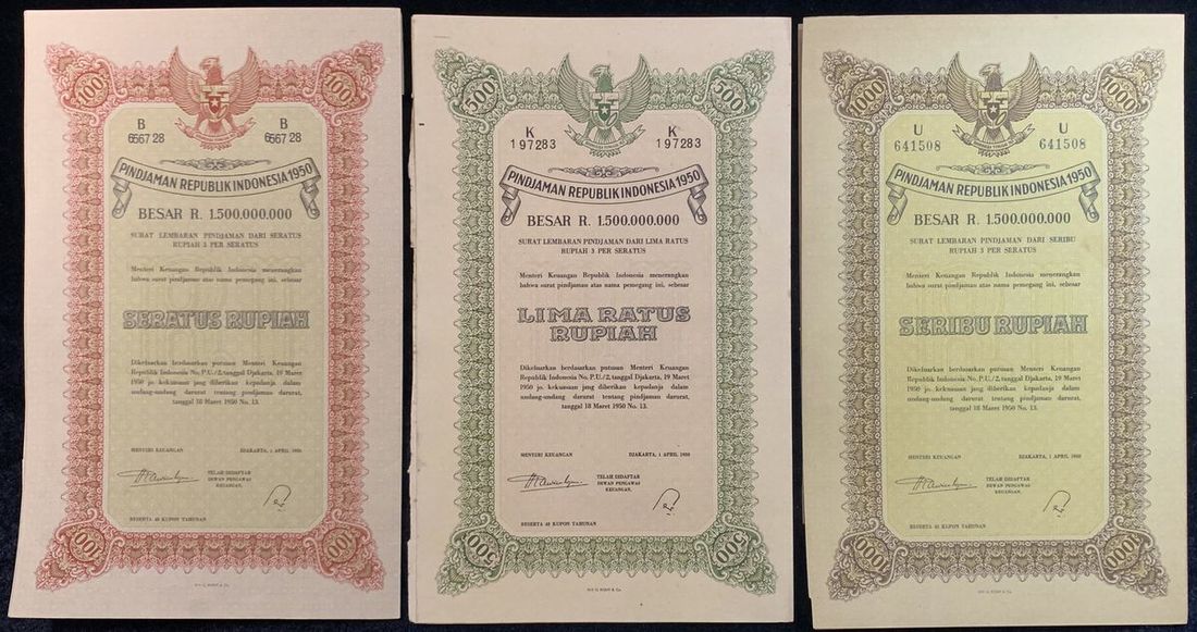 Indonesia, a set of 100, 500, 1000 rupiah bonds, 3% interest, 1950, serial number B656728, K197283 and U641508, vertical format, National emblem at top centre, all with coupons,