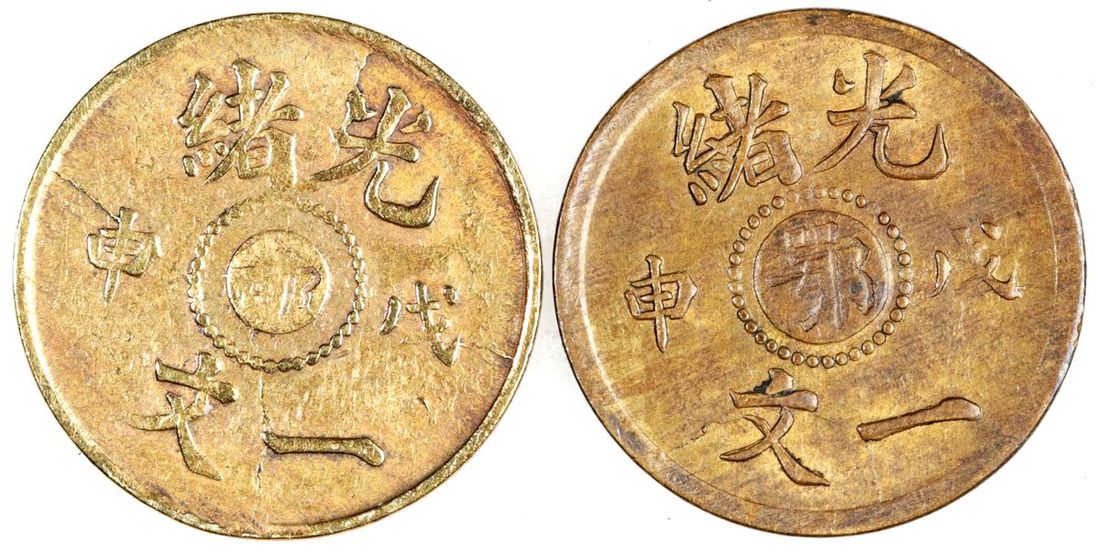 China, Qing Dynasty, Hupeh Province, a pair of brass 1 cash, Wushen year (1908), Chinese character 'E' at centre on reverse, small mintmark, (Y-7j), Extremely Fine and Choice Very Fine (2)