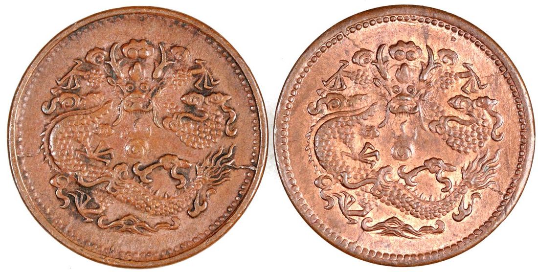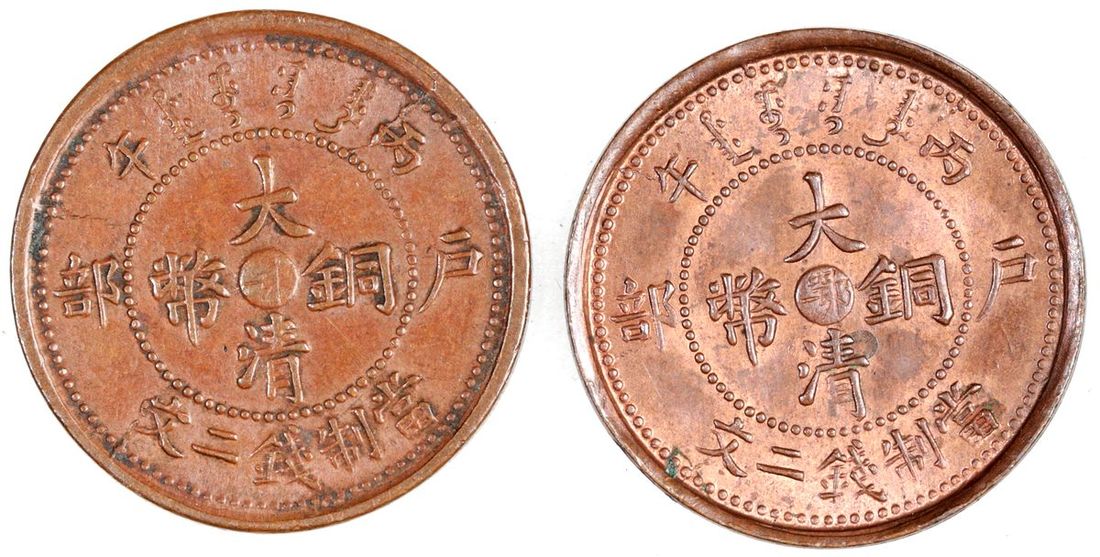 China, Qing Dynasty, Hupeh Province, a pair of copper 2 cash, Bingwu year (1906), Hupeh Province mint ('Hu Bu' Board of Revenue approved), 'Da Qing Tong Bi', Chinese character 'E' at centre on reverse, (Y-8j), About Uncirculated and Extremely Fine (2)