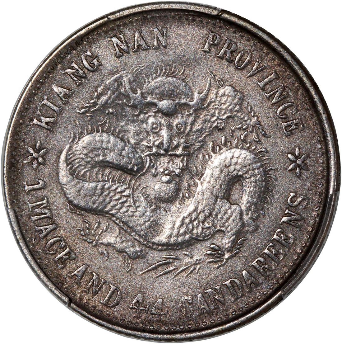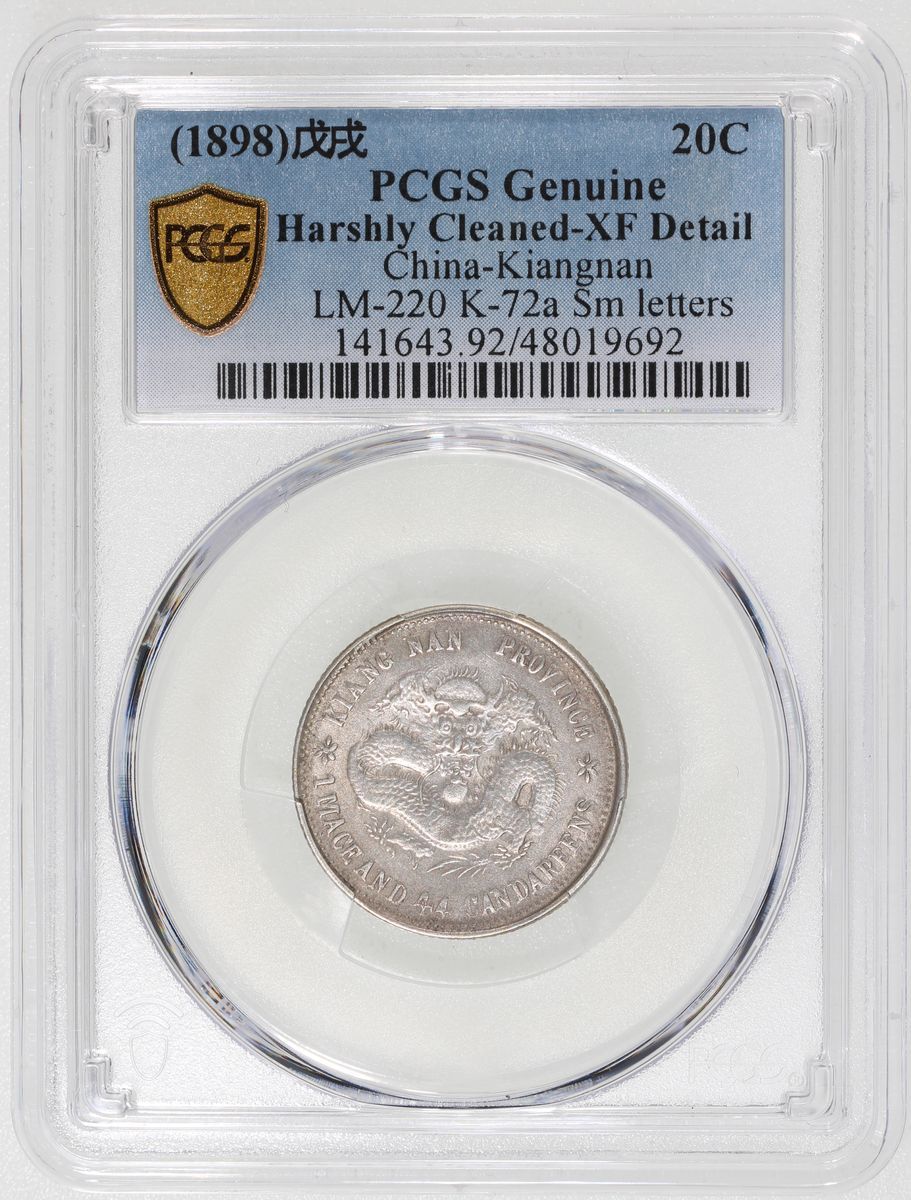 China, Qing Dynasty, Kiangnan Province, [PCGS XF Detail] silver 20 cents, Guangxu Yuan Bao, Wuxu(1898), old dragon, small letters variant, (LM-220), harshly cleaned. Cert.# 48019692