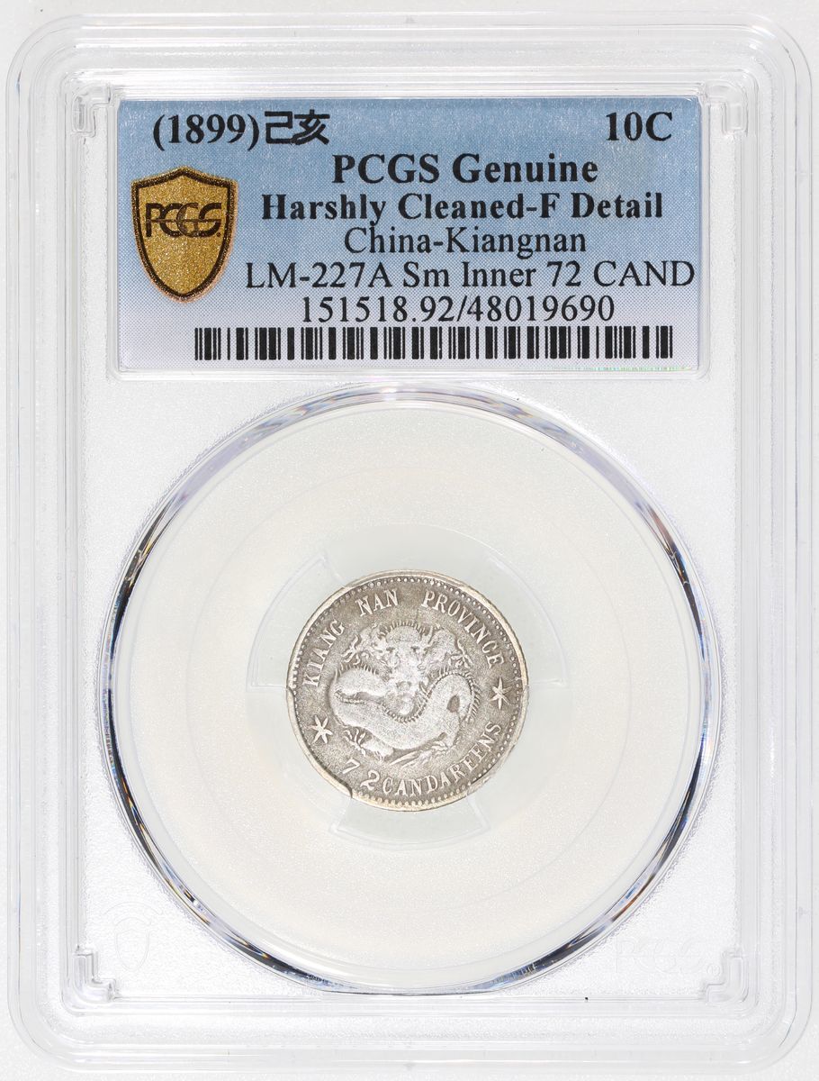 China, Qing Dynasty, Kiangnan Province, [PCGS F Detail] silver 10 cents, Guangxu Yuan Bao, Jihai(1899), old dragon, small inner characters, 7.2(72) variant, (LM-227A), harshly cleaned. Cert.# 48019690