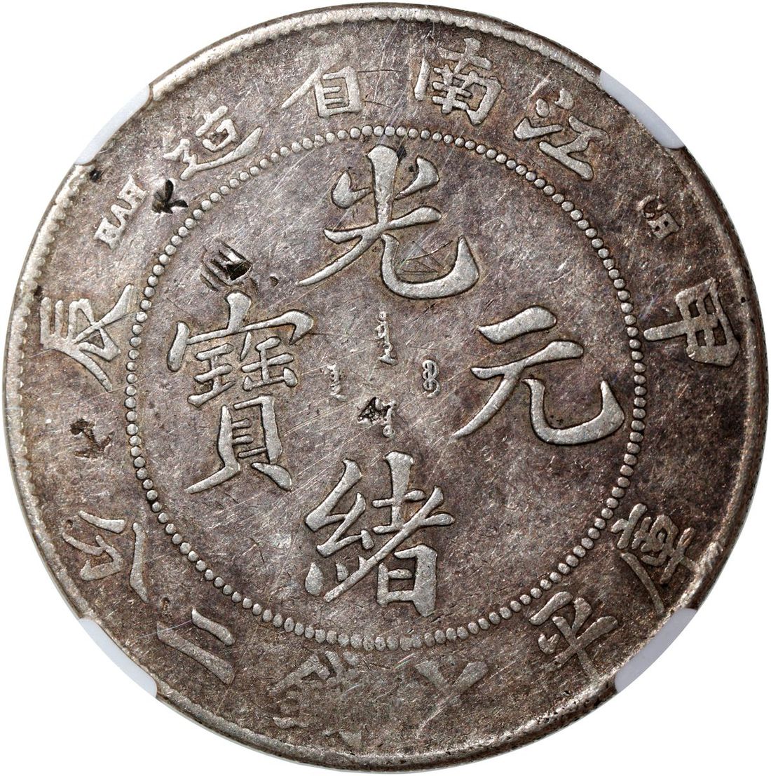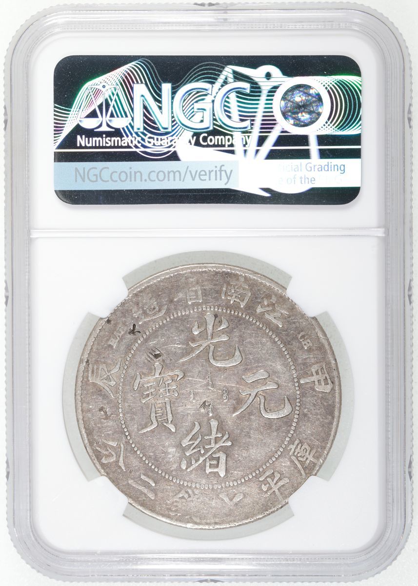 江南省造甲辰光緒元寶庫平七錢二分,NGC VF Details,有戳記及劃痕