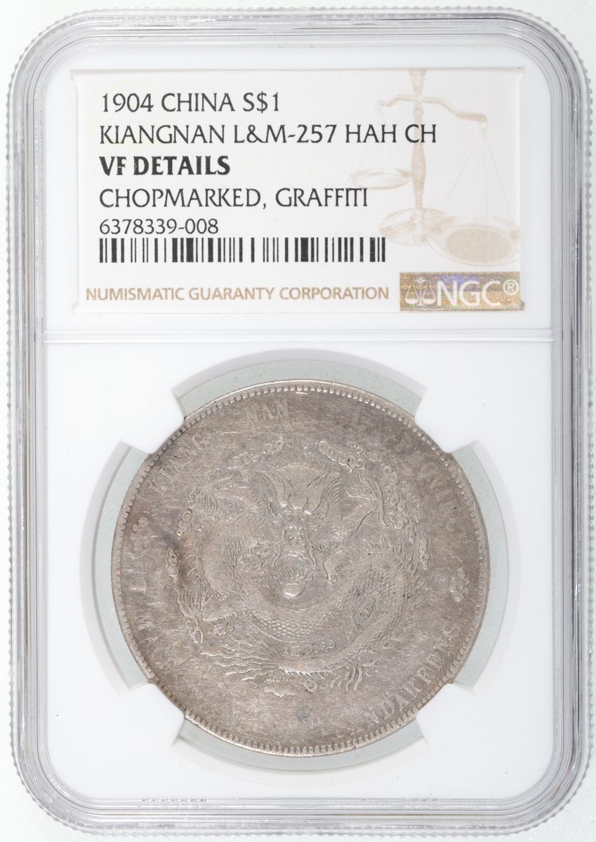 China, Qing Dynasty, Kiangnan Province, [NGC VF Details] silver dollar, Jiachen year (1904), 'Guang Xu Yuan Bao', variety with 'CH' and 'HAH' at legends on reverse, (LM-257, K-99), Chopmarked, Graffiti, cert. #6378339-008