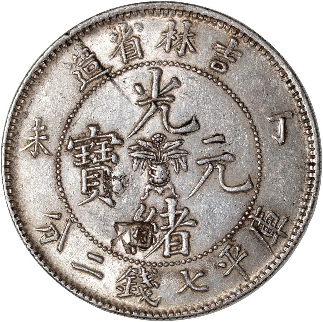 吉林省造丁未年光緒元寶庫平七錢二分,XF,背面有戳記,稀有品種