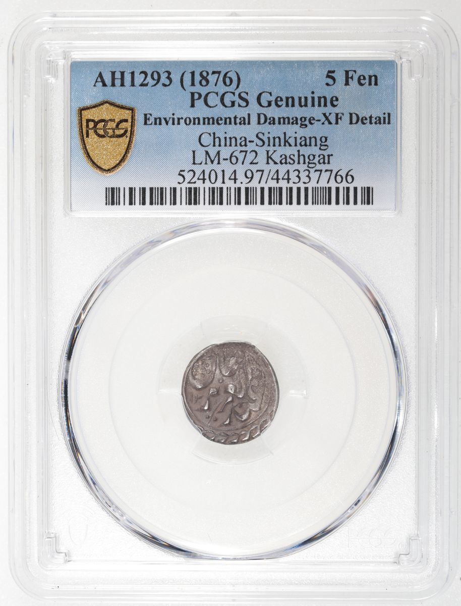 China, Qing Dynasty, Sinkiang Province, [PCGS XF Detail] silver 5 fen, AH1293 (1876), Kashgar mint, (LM-672), Environmental Damage, cert. #44337766