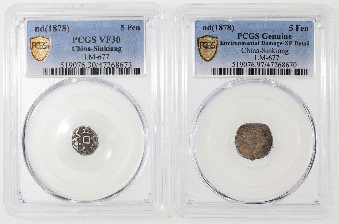 China, Qing Dynasty, Sinkiang Province, a pair of 5 fen, ND (1878), (LM-677), PCGS VF30 and XF Detail (environmental damage) respectively. #47268673 / 47268670 (2)