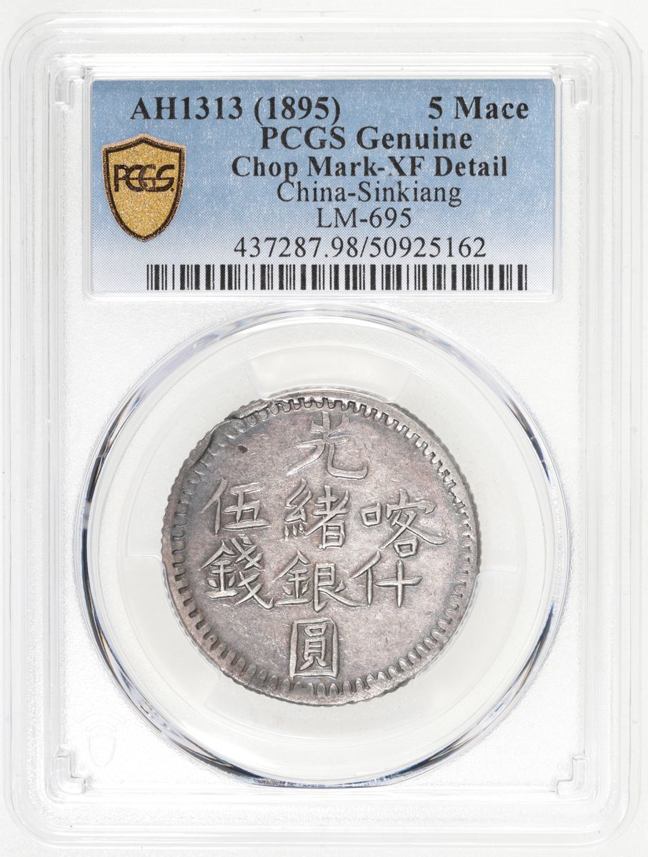 China, Qing Dynasty, Sinkiang Province, [PCGS XF Detail] silver 5 mace, AH1313 (1895), 'Guang Xu Yin Yuan', Kashgar mint, (LM-695), Chop Mark, cert. #50925162, highly attractive blue hues on both sides