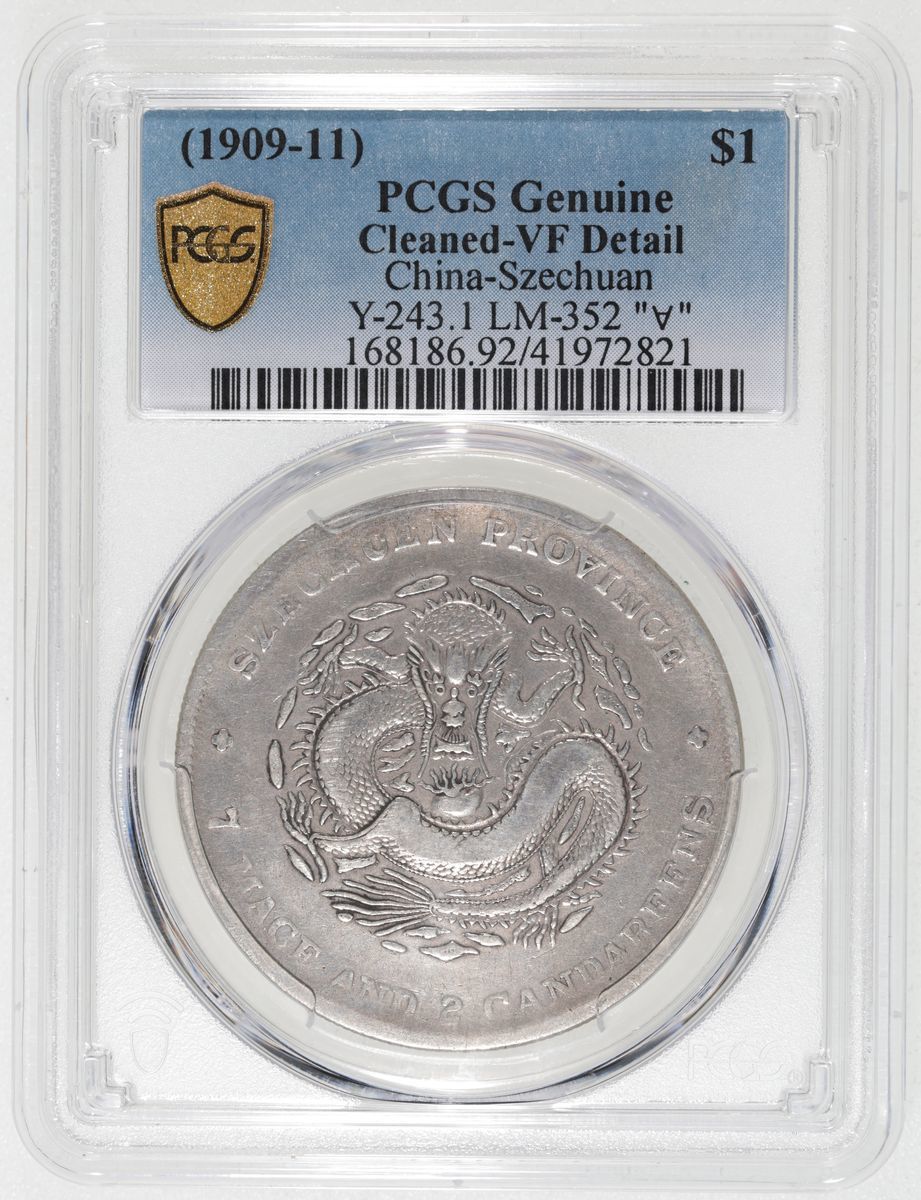 China, Qing Dynasty, Szechuan Province, [PCGS VF Detail] silver dollar, ND (1909-1911), 'Xuan Tong Yuan Bao', inverted 'A' in place of 'V' in 'PROVINCE' on obverse variety,
